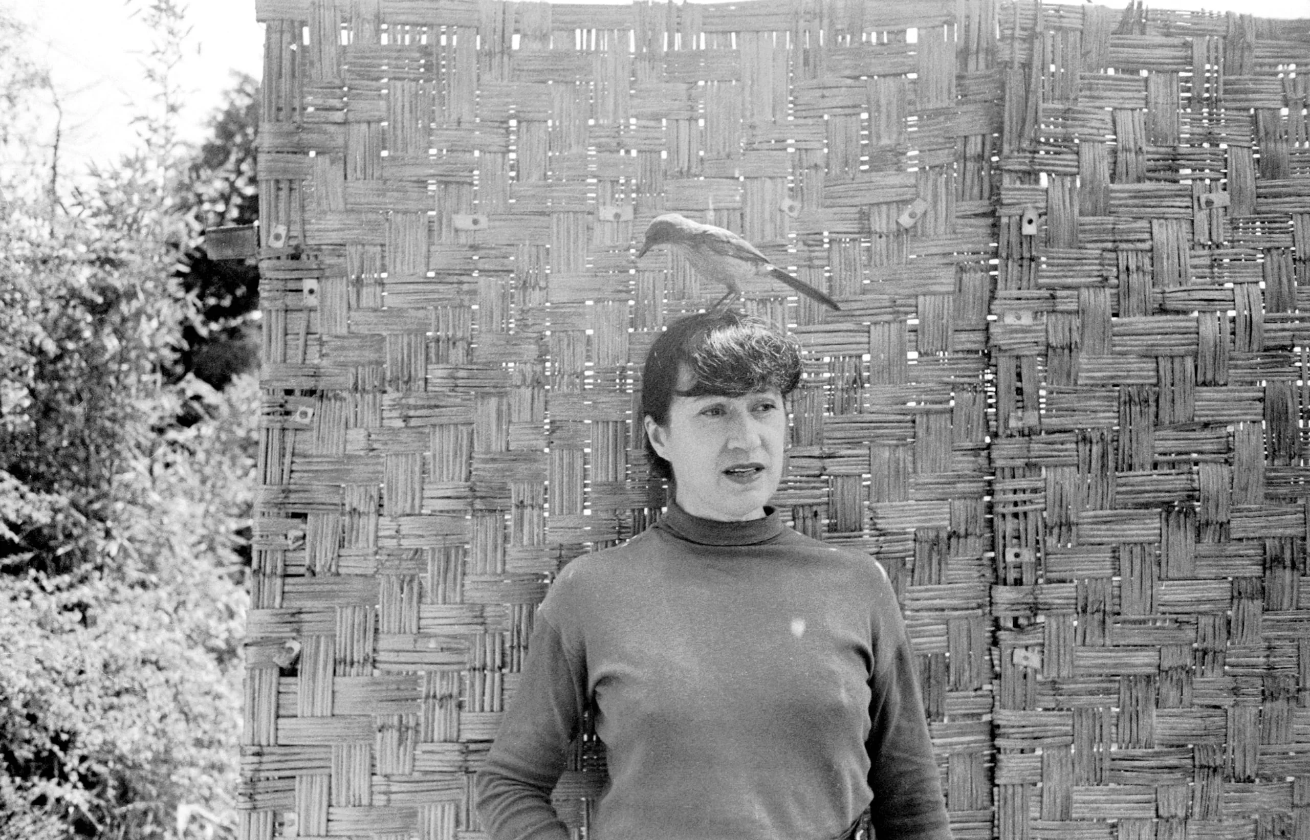 Black and white photograph of a woman in a turtleneck standing before a woven bamboo panel, a small bird perched on her head