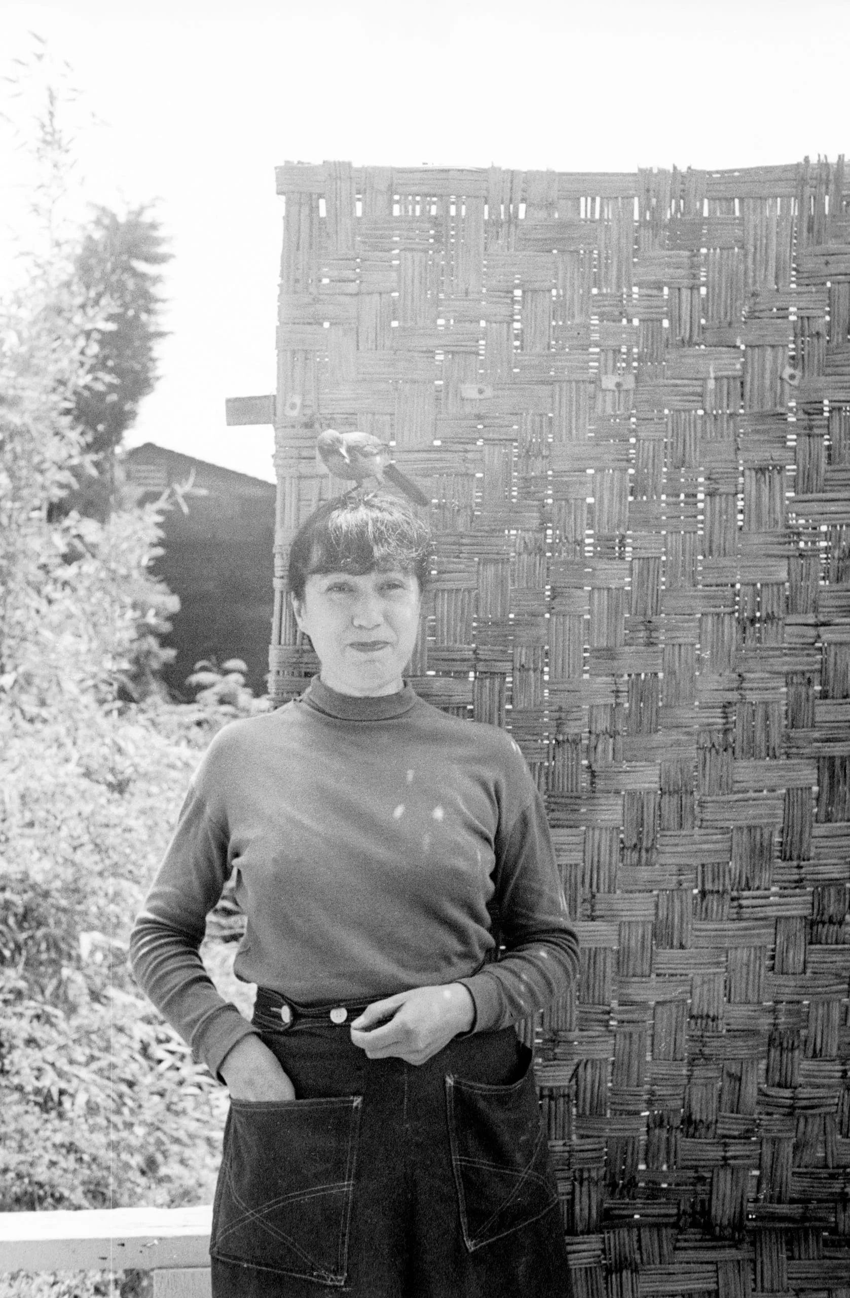 Black and white photograph of a woman standing outdoors, facing camera, with a small bird perched on her head, a woven reed panel behind her