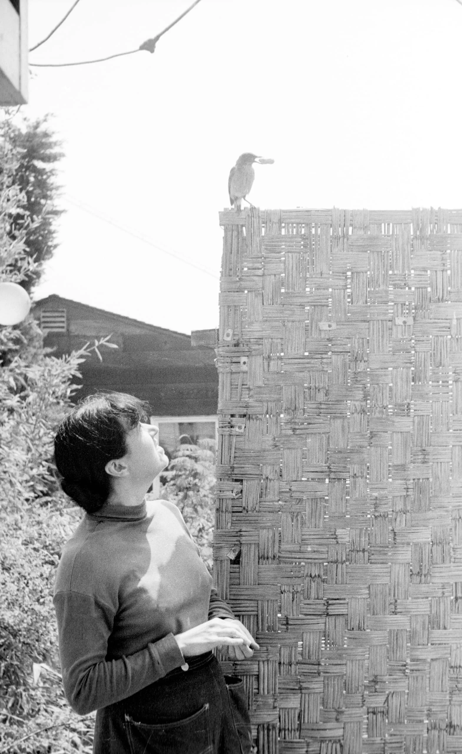 Black and white photograph of a person in a turtleneck looking up at a bird perched atop a large woven bamboo panel outdoors