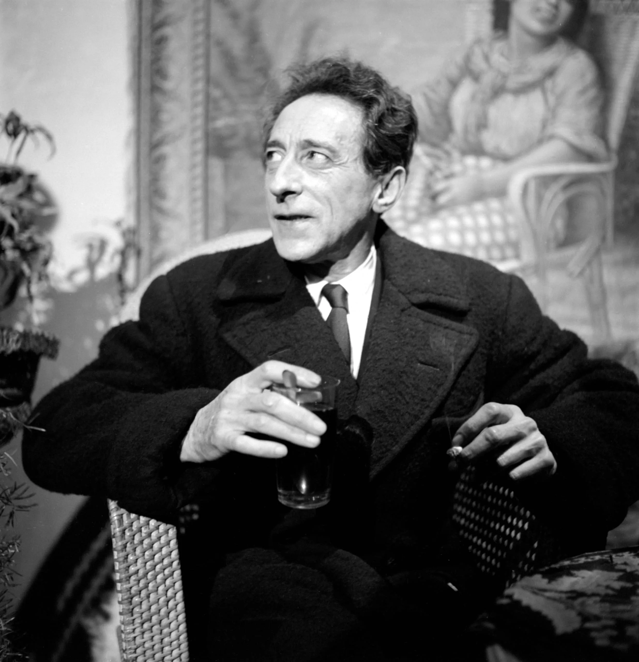 Black and white photograph of a white man seated in a wicker chair, holding a glass and cigarette, with a painted panel visible behind him