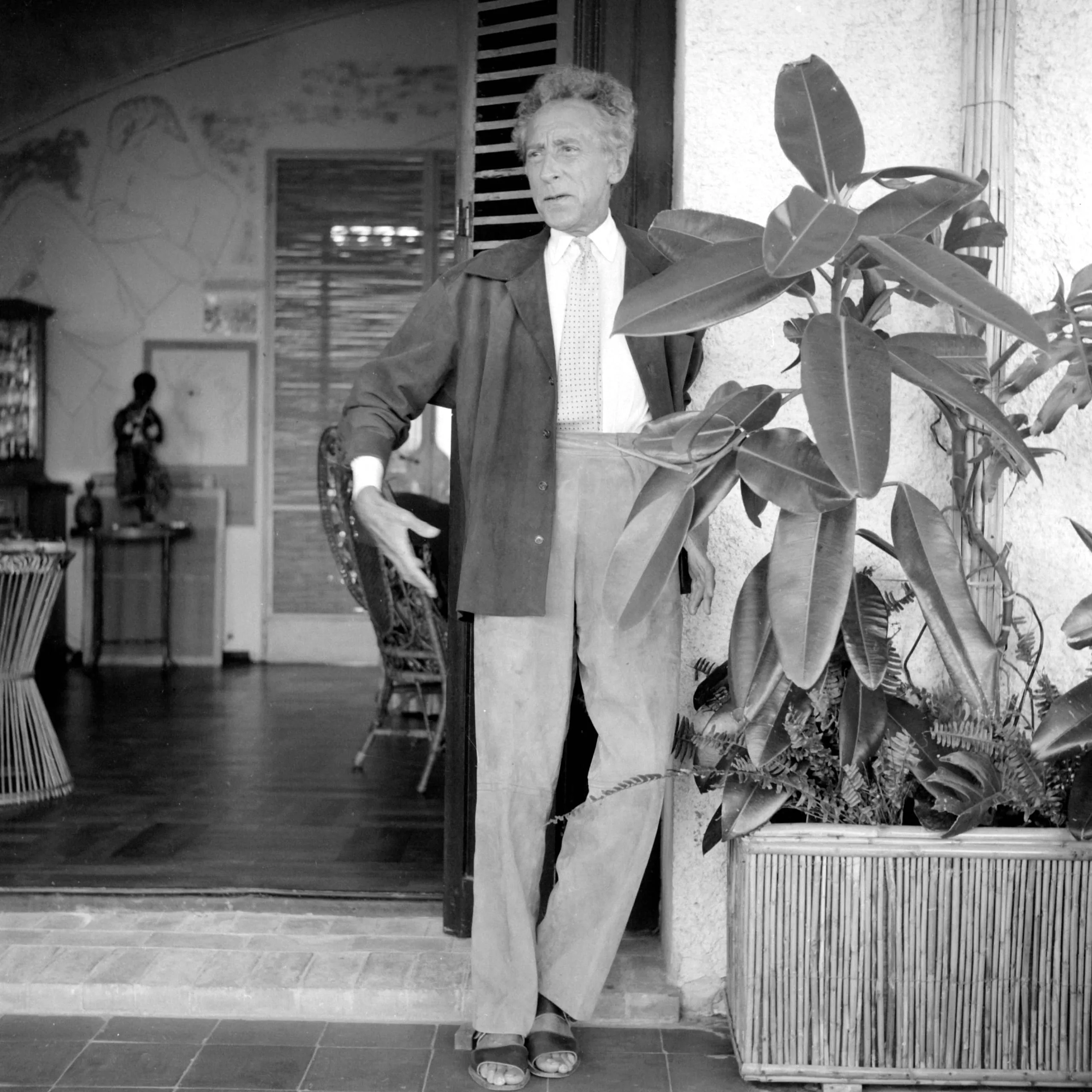 Black and white full-length photograph of a lean older man with gray hair standing in a doorway, wearing a dark blazer, light trousers, and sandals, beside a large potted rubber plant