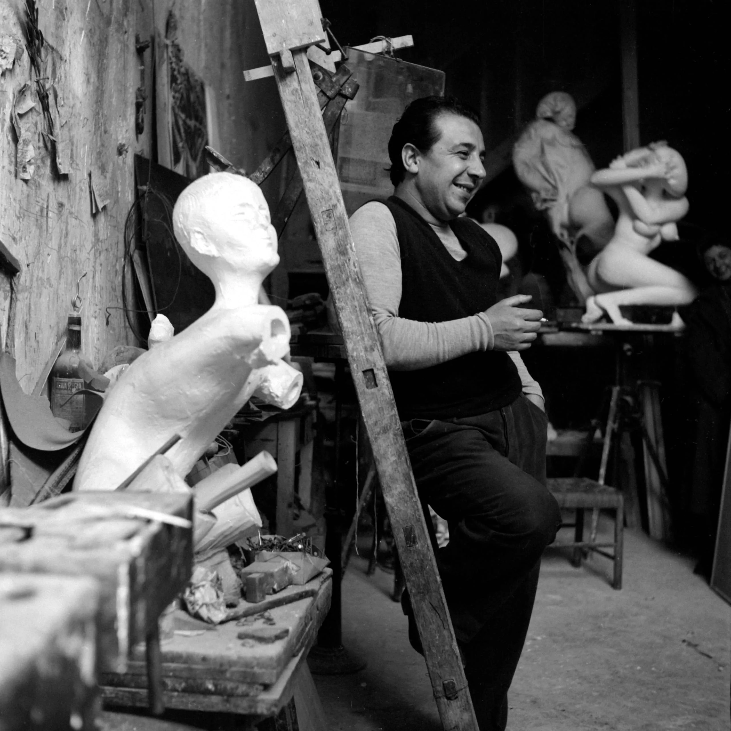 Black and white photograph of a laughing man in a studio, standing beside a wooden easel and white plaster sculptures