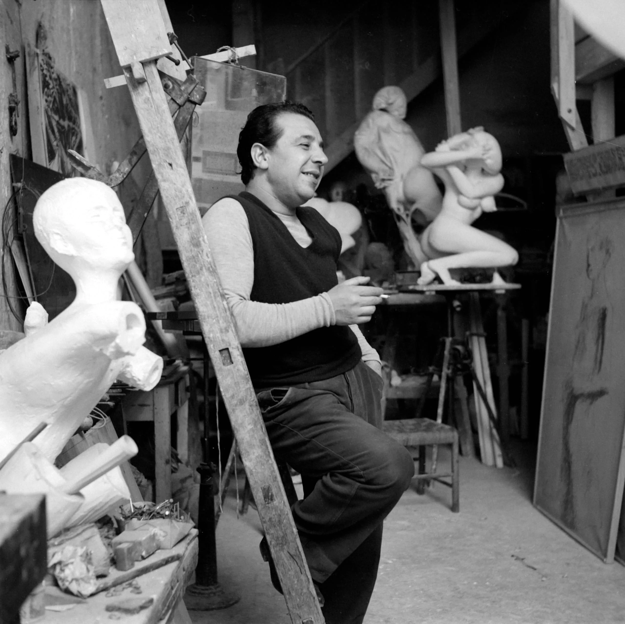 Black and white photograph of a smiling man in a sleeveless vest seated in a sculptor's studio, surrounded by white plaster figures and a wooden easel