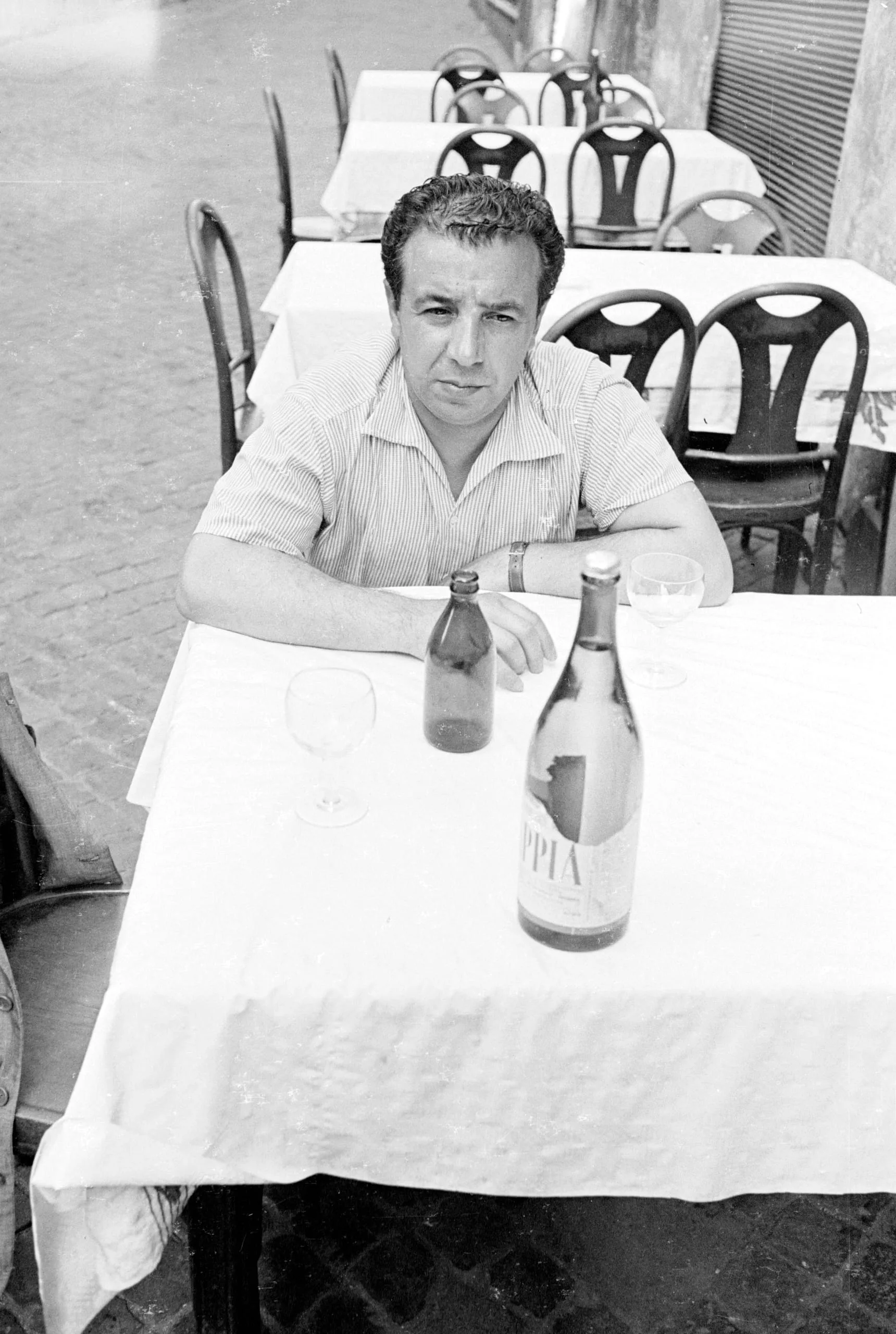 Black and white photograph, a man with dark hair seated at a white-clothed outdoor café table, arms crossed, looking up at the camera, two wine bottles and glasses before him