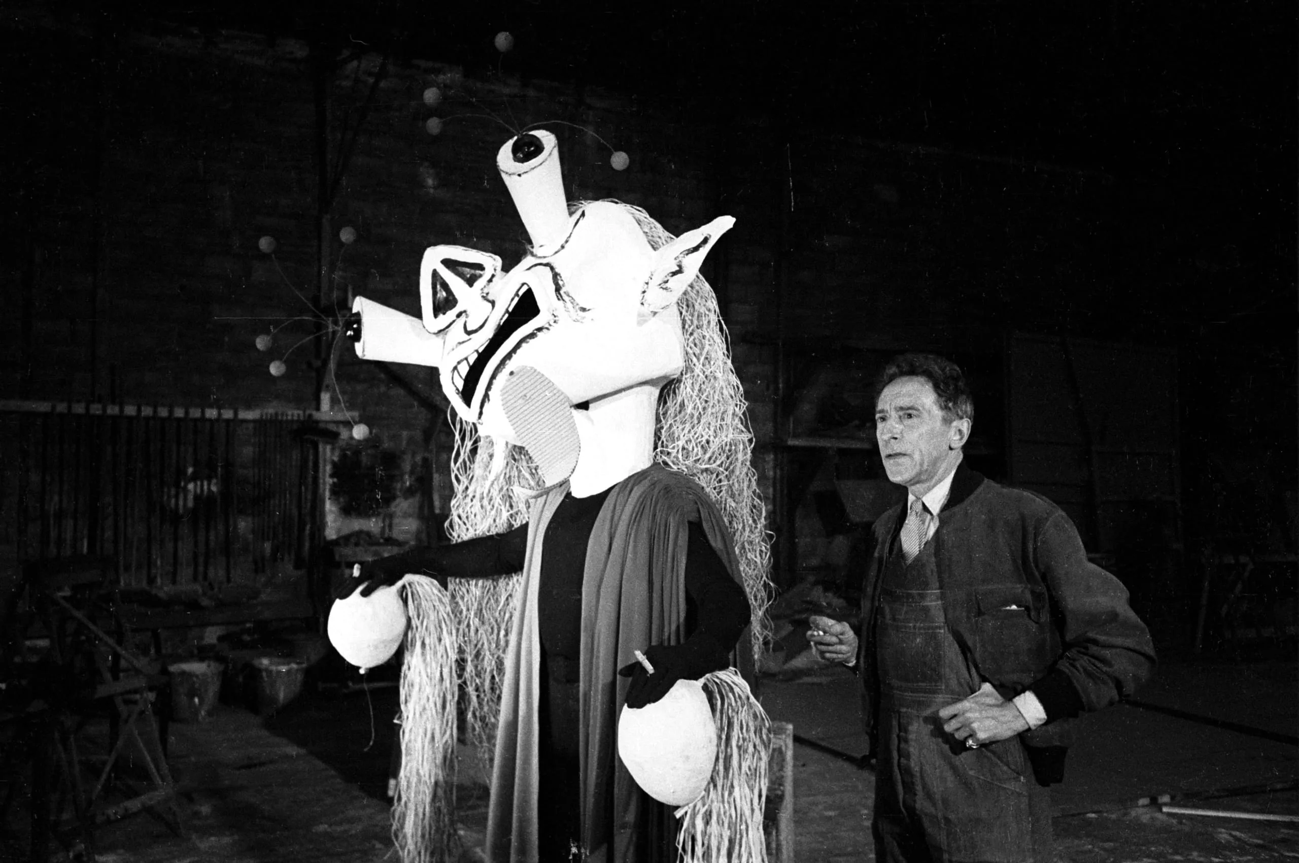 Black and white photograph of a man in a work shirt standing beside a towering abstract figure with a white painted head, rope hair, and dark draped body, in a dim studio