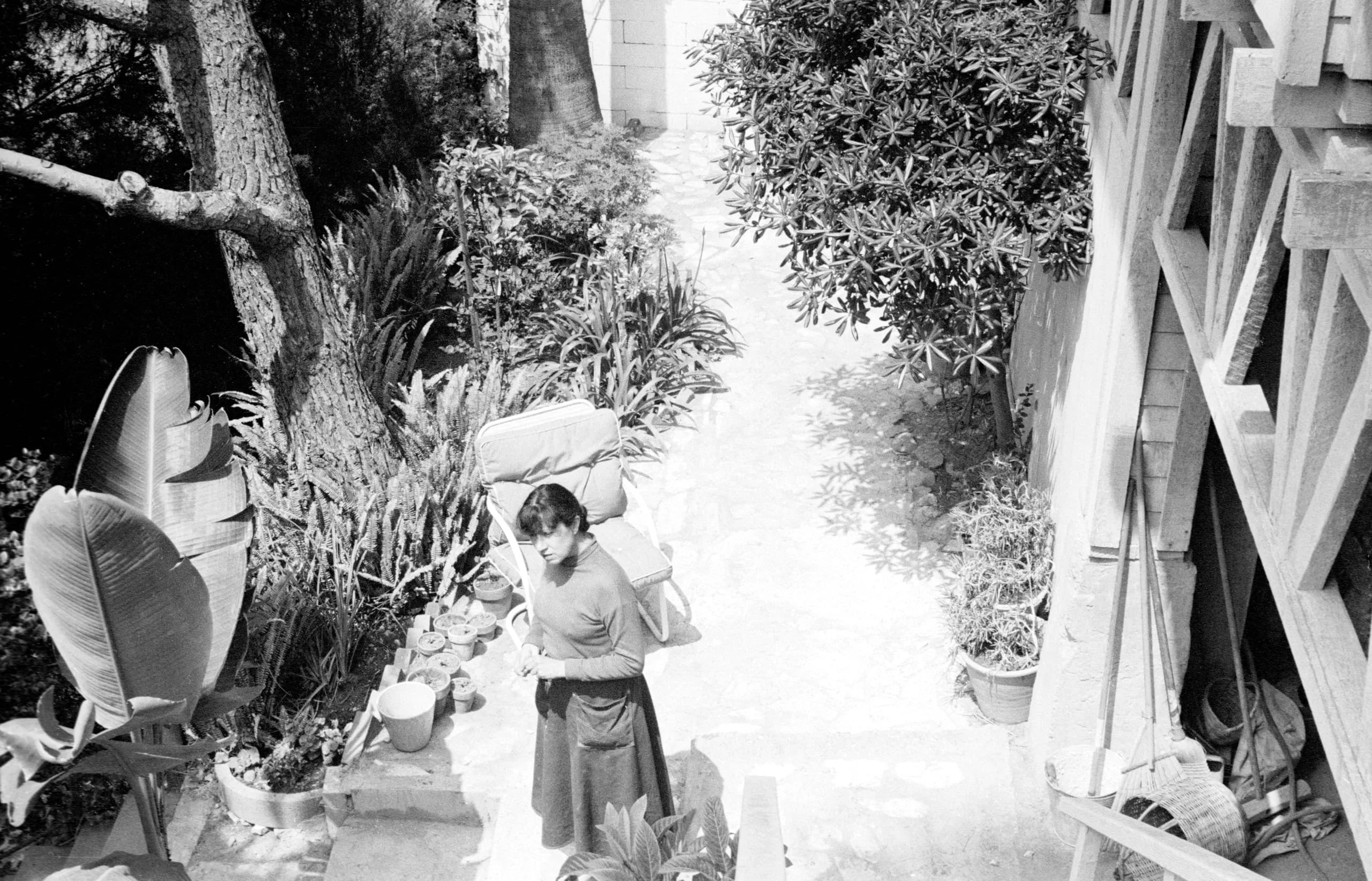 Black and white photograph shot from above, a woman carrying a large bundle on her shoulder stands in a narrow garden walkway flanked by potted plants and trees