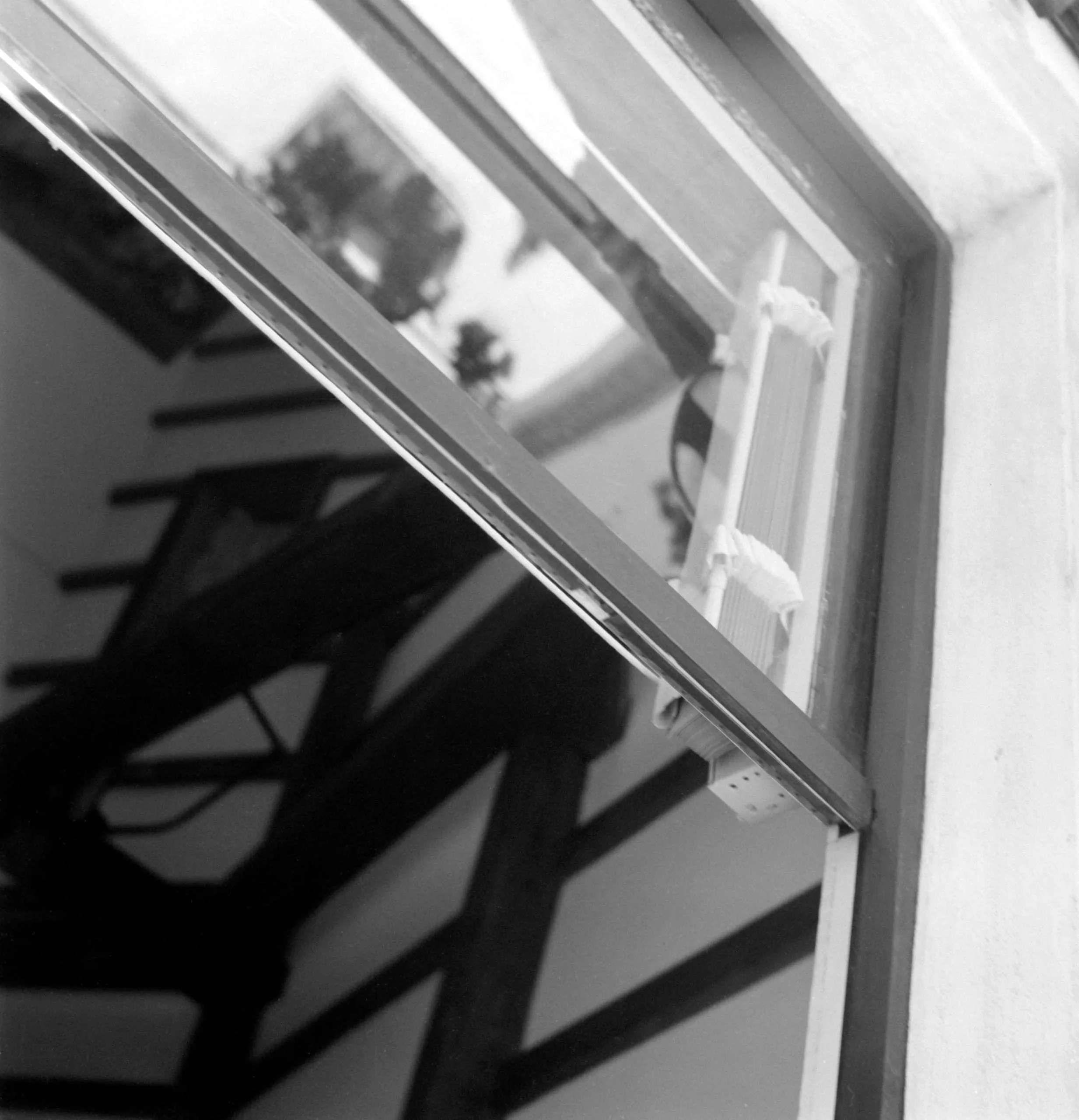 Black and white photograph looking up along the edge of a glass panel, with bold diagonal shadows cast across its surface and small white hardware fixtures along the metal frame