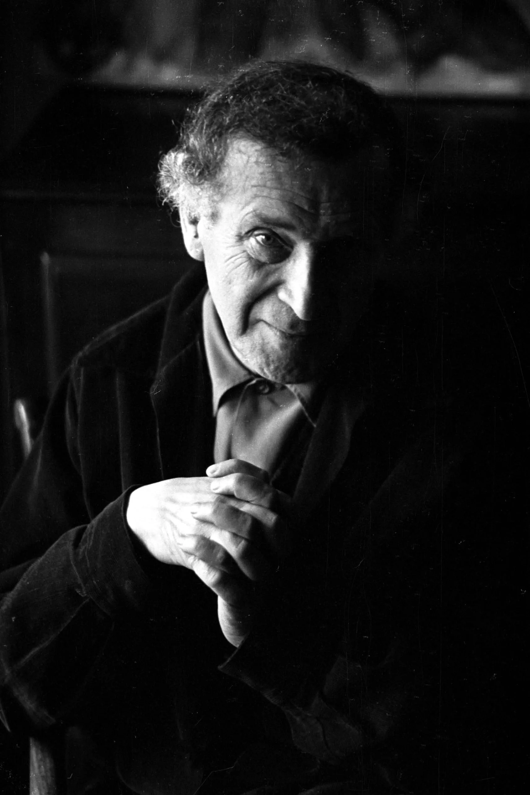 Black and white portrait photograph of an older man, three-quarter view, strongly lit from the right with deep shadows, hands clasped near chin