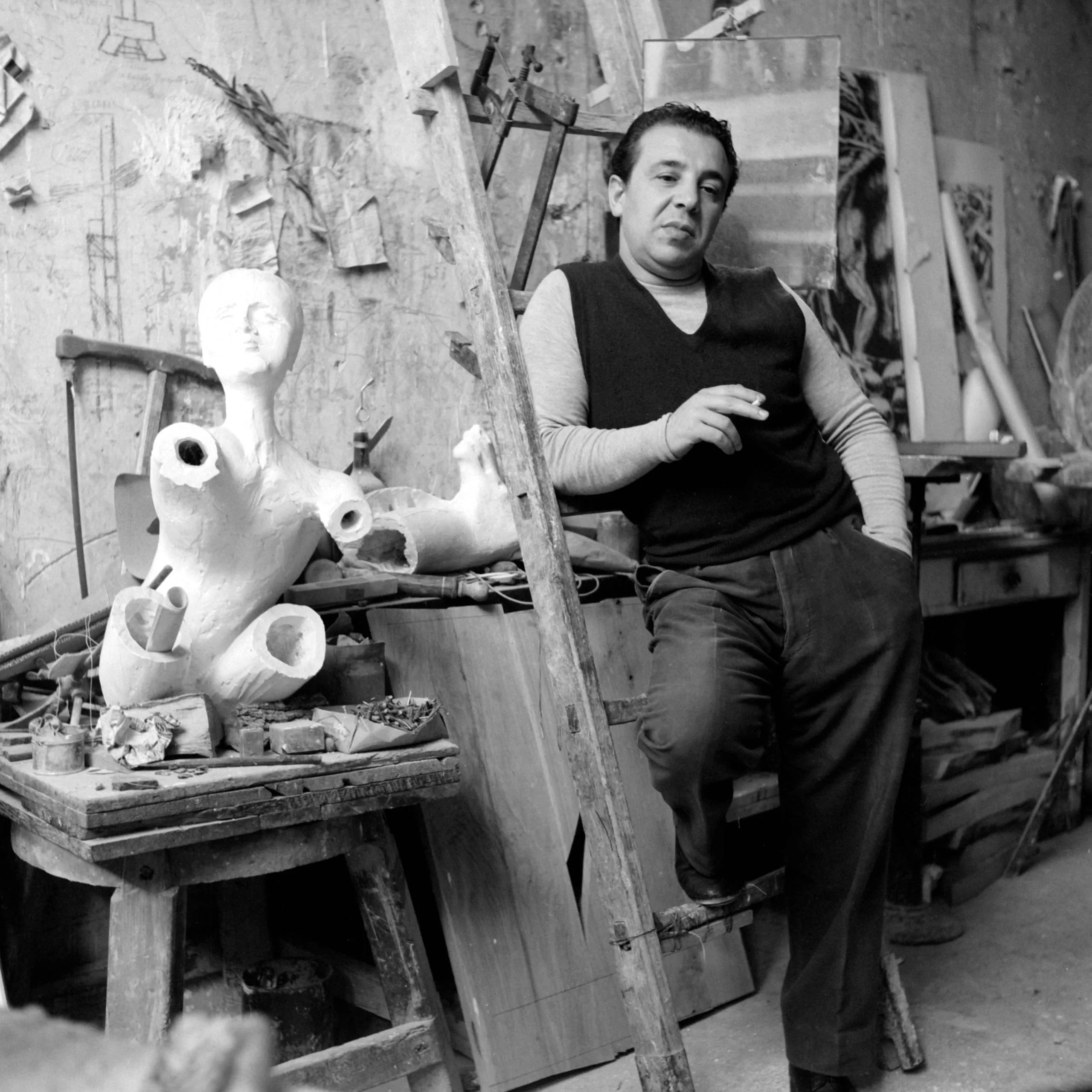 Black and white photograph of a man in a studio, seated beside a plaster sculpture of a partial female figure, holding a cigarette