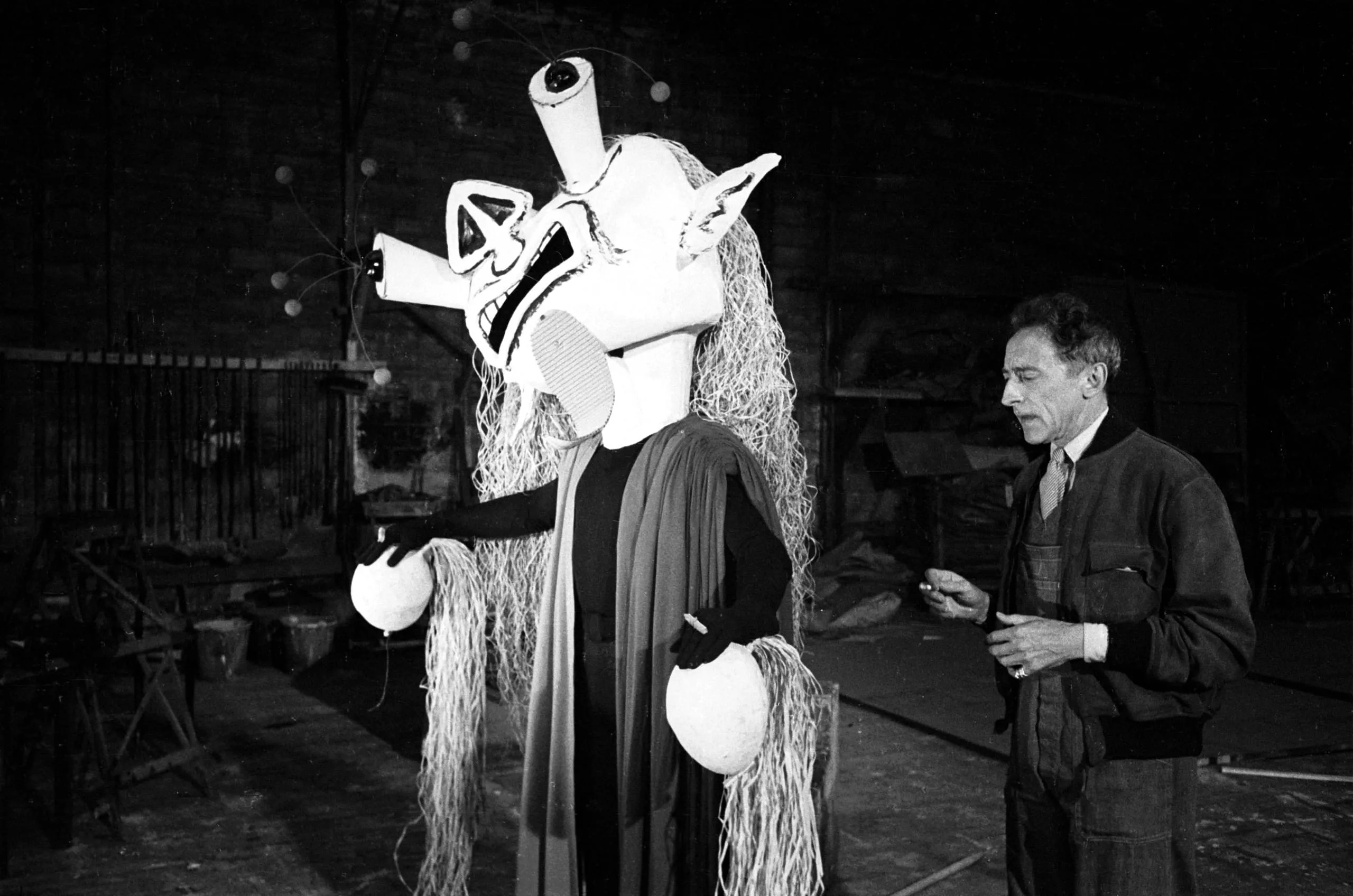Black and white photograph of a towering grotesque puppet or costume figure with an abstract white head and dark robes, standing beside a man in a dark work jacket in a dimly lit studio
