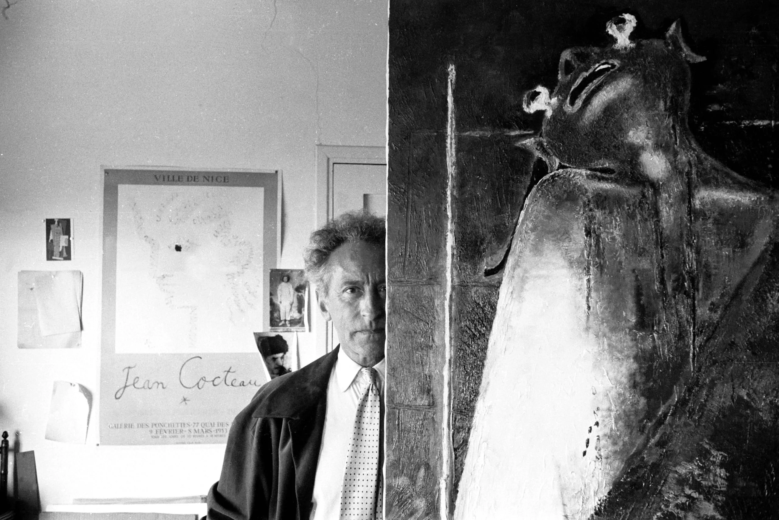 Black and white photograph split between a man standing before a Jean Cocteau exhibition poster and a thickly painted canvas of an open-mouthed figure