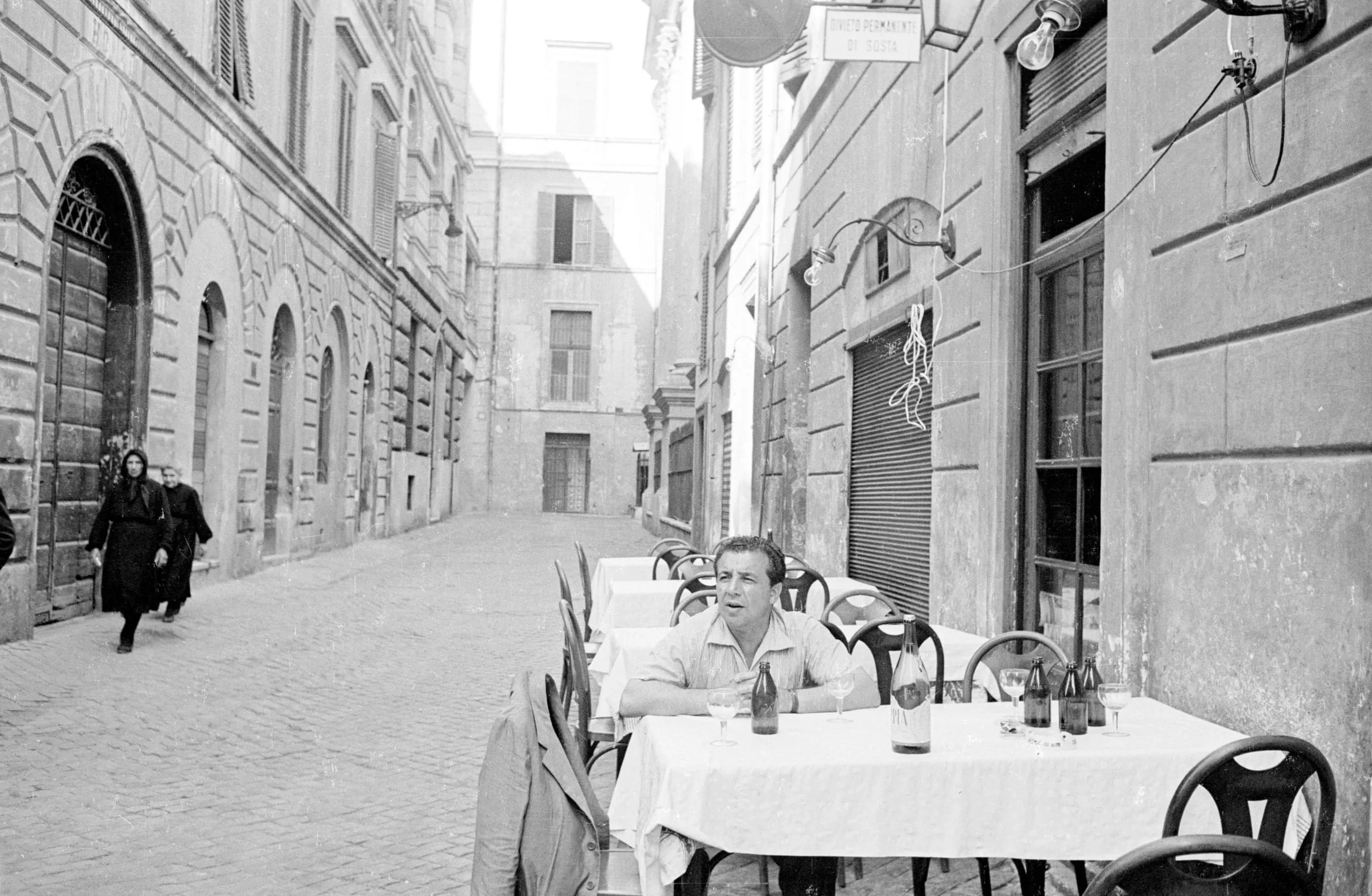 Black and white photograph of a man seated alone at an outdoor café table on a narrow European cobblestone street, with empty tables and tall stone buildings behind him