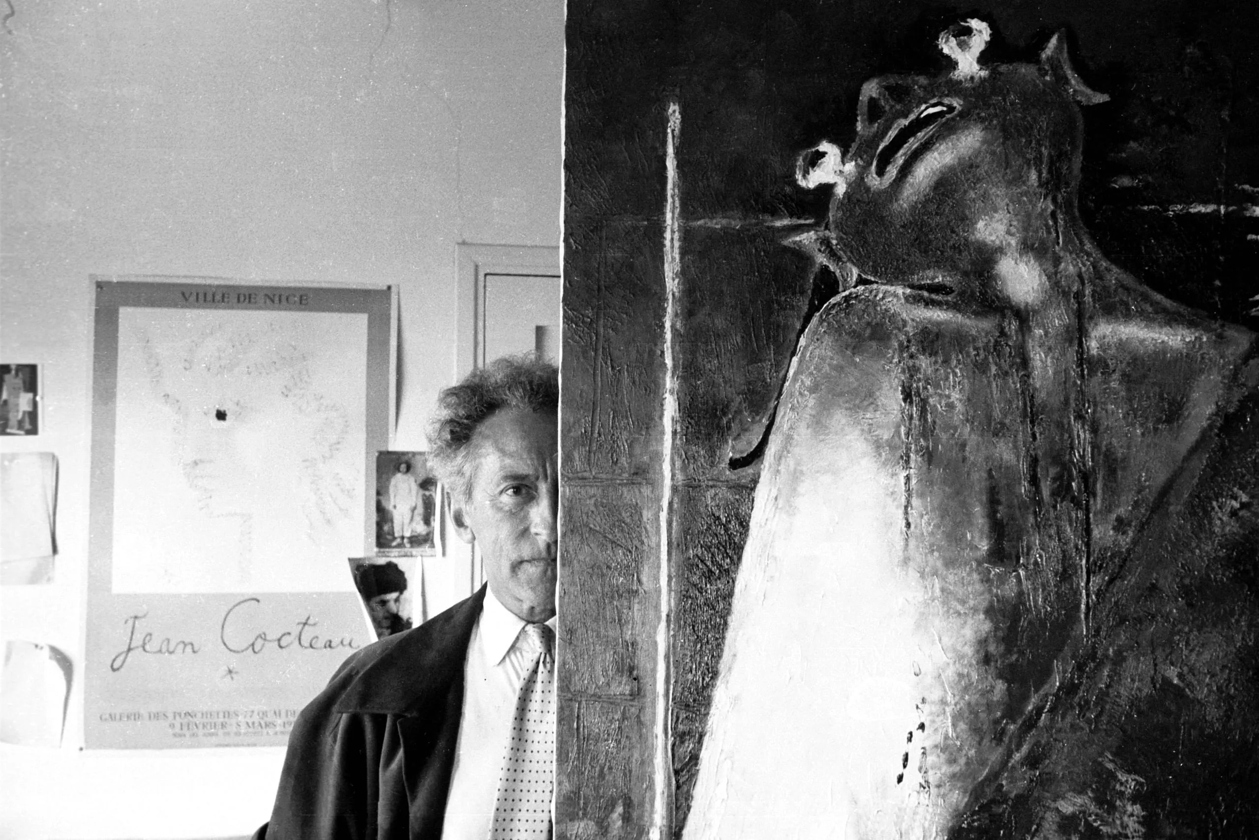 Black and white photograph of a man in a dark blazer standing beside a large dark figurative painting, with a Jean Cocteau exhibition poster visible on the wall behind him
