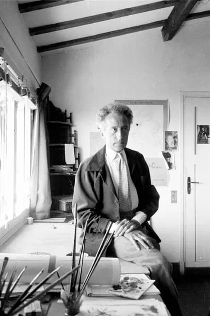 Black and white photograph of an older man with gray hair seated in a studio, wearing a dark blazer, looking directly at the camera