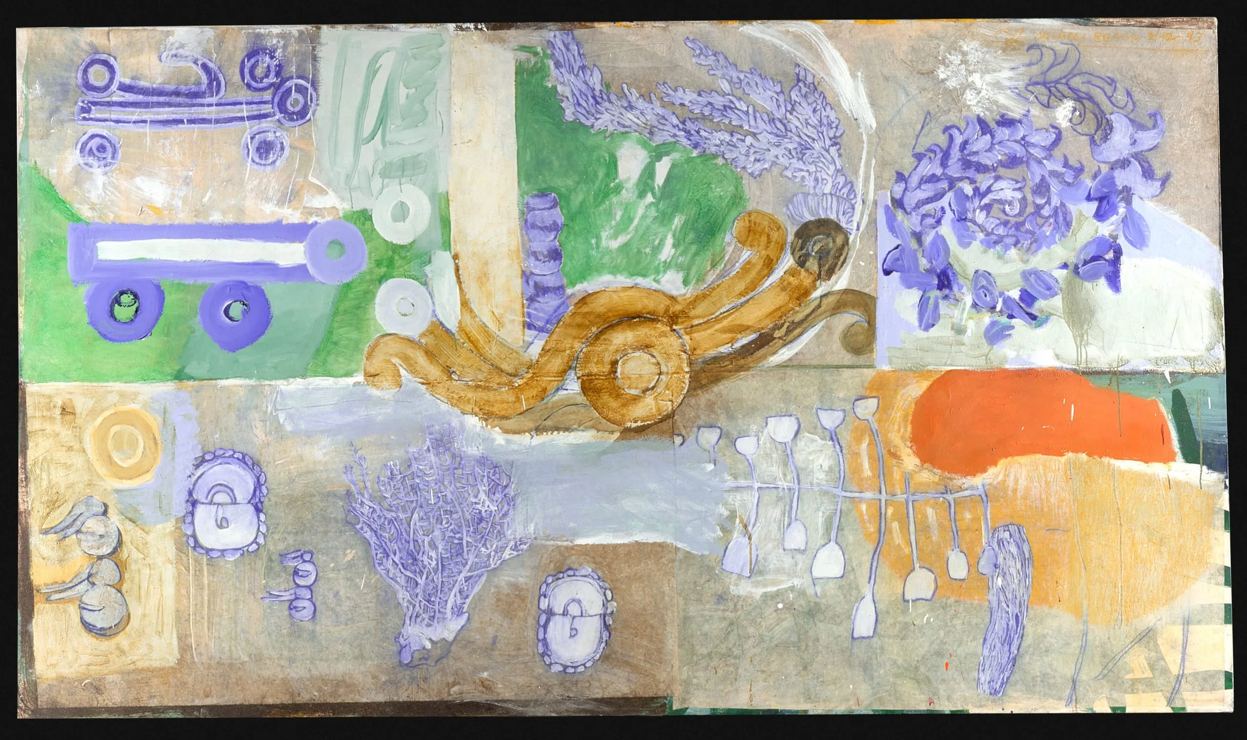 - Acrylic, peat moss, Japanese paper, and oilstick on linen