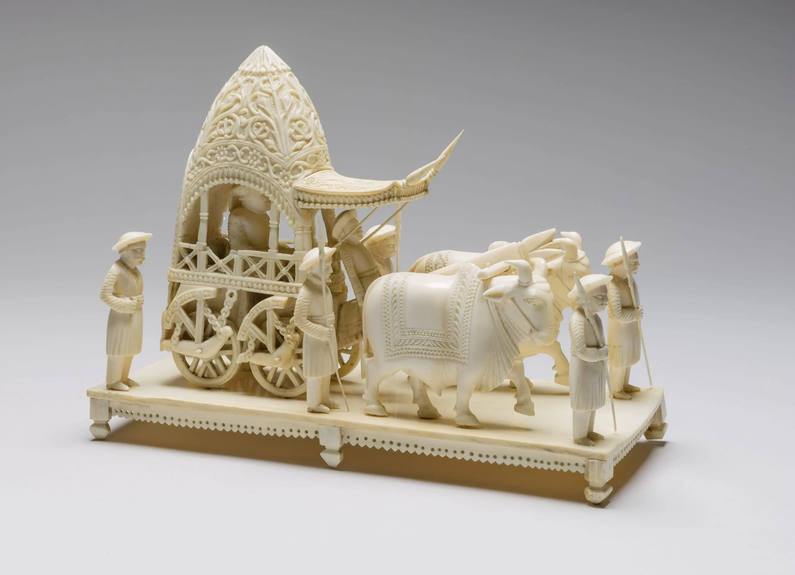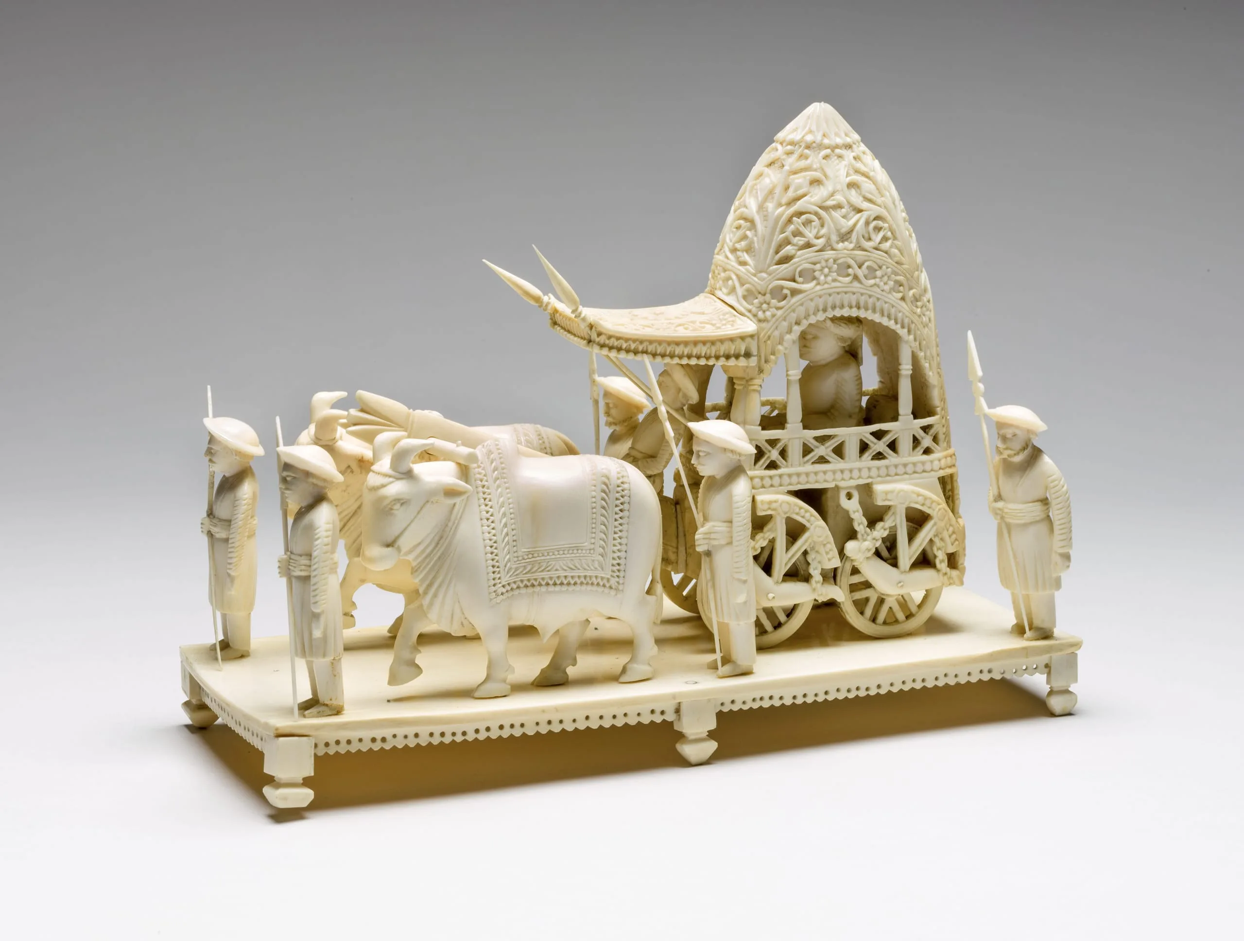 This ivory model of a bullock cart with a royal rider is a parallel expression in sculpture of the numerous paintings, drawings, and photographs representing occupations and activities that were popular among the many European residents and visitors in India during the 18th and 19th centuries. The varied subjects depicted include craftsmen, nautch dancing girls, soldiers, circus performers, bureaucrats, elephants with canopied howdahs, and royal pursuits such as enjoying a river cruise on a peacock barge (see M.82.154). Here, an Indian ruler or prince is riding in a canopied cart drawn by two yoked bulls and driven by a standing male under an awning. The cart’s superstructure is embellished with foliate designs. The substructure of the cart employs a complex double strut system attached with chains to the cart. Six sentries holding spears guard the royal protectee at the corners and midpoints of the platform. See also AC1994.230.2.