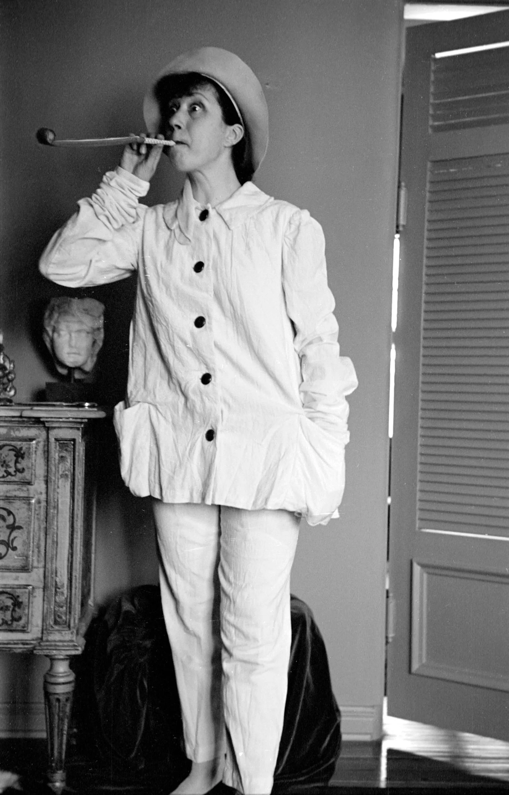 Black and white photograph, full-length portrait of a woman in a loose white jacket and trousers, dome hat, holding a cigarette holder to her lips and looking upward