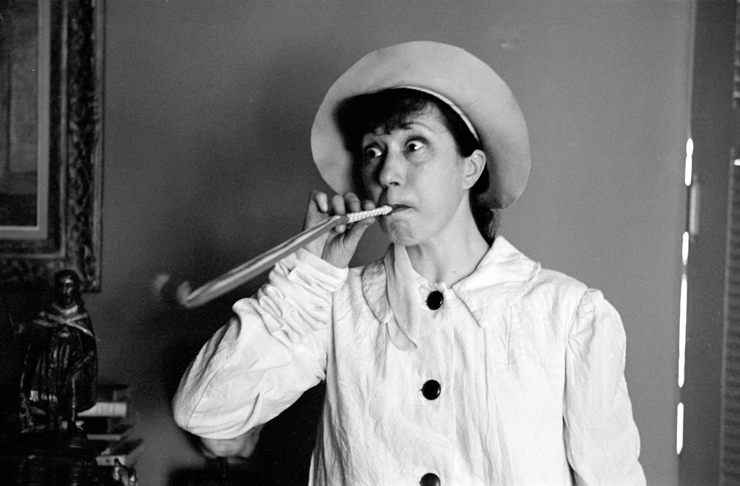 Black and white photograph, woman in white button-front jacket and pale brimmed hat, blowing into a small horn or noisemaker, eyes wide and glancing to the side