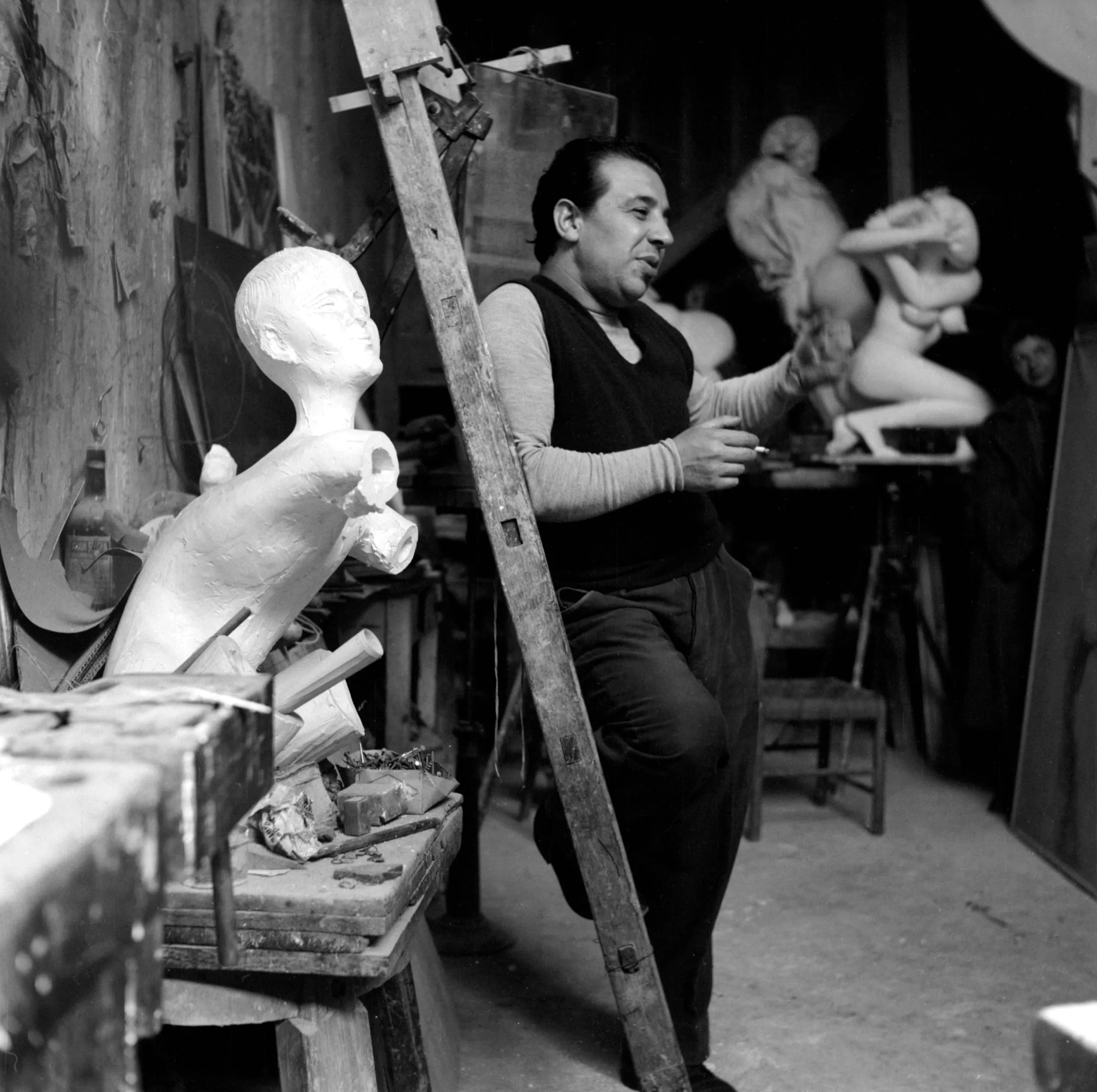 Black and white photograph of a man working in a sculptor's studio, surrounded by white plaster figurative sculptures on worktables and stands