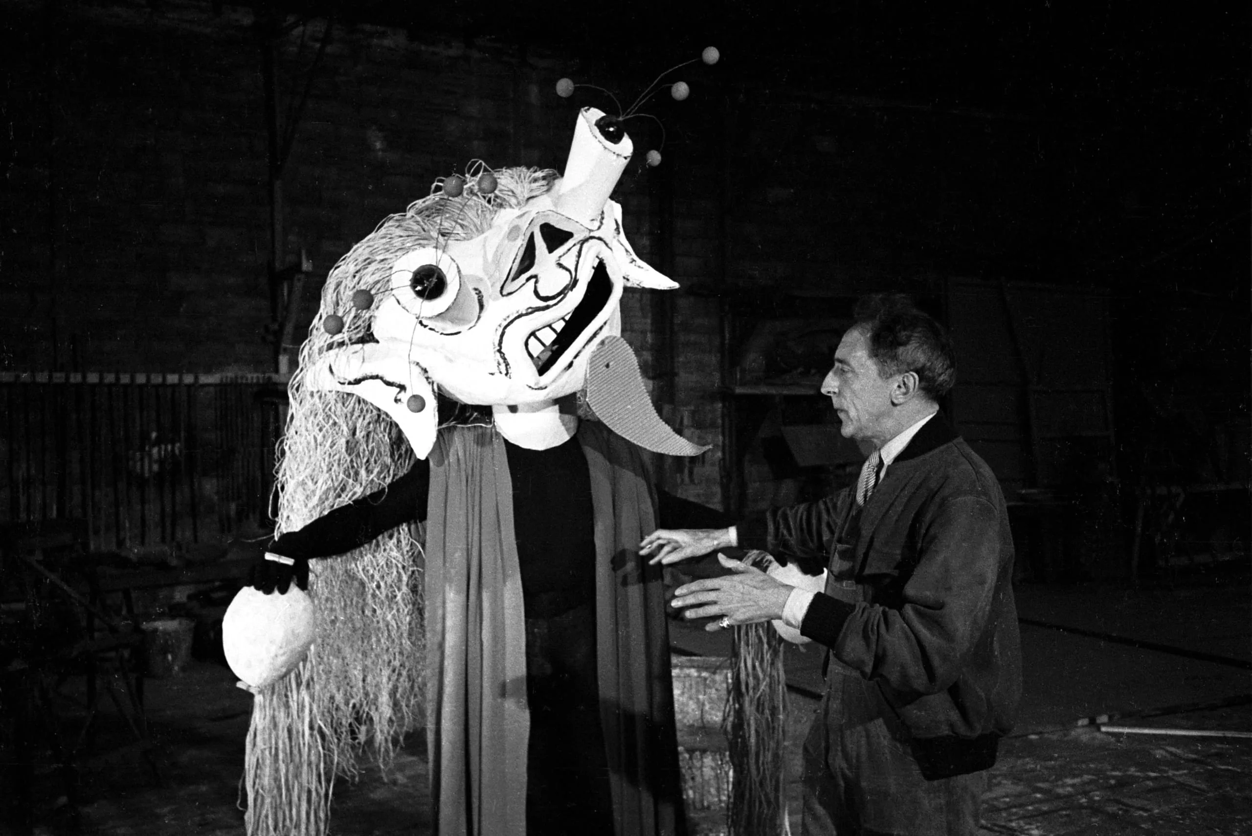 Black and white photograph of a man in a work coat gesturing toward a figure wearing an oversized grotesque theatrical mask with straw-like hair, in a darkened studio space