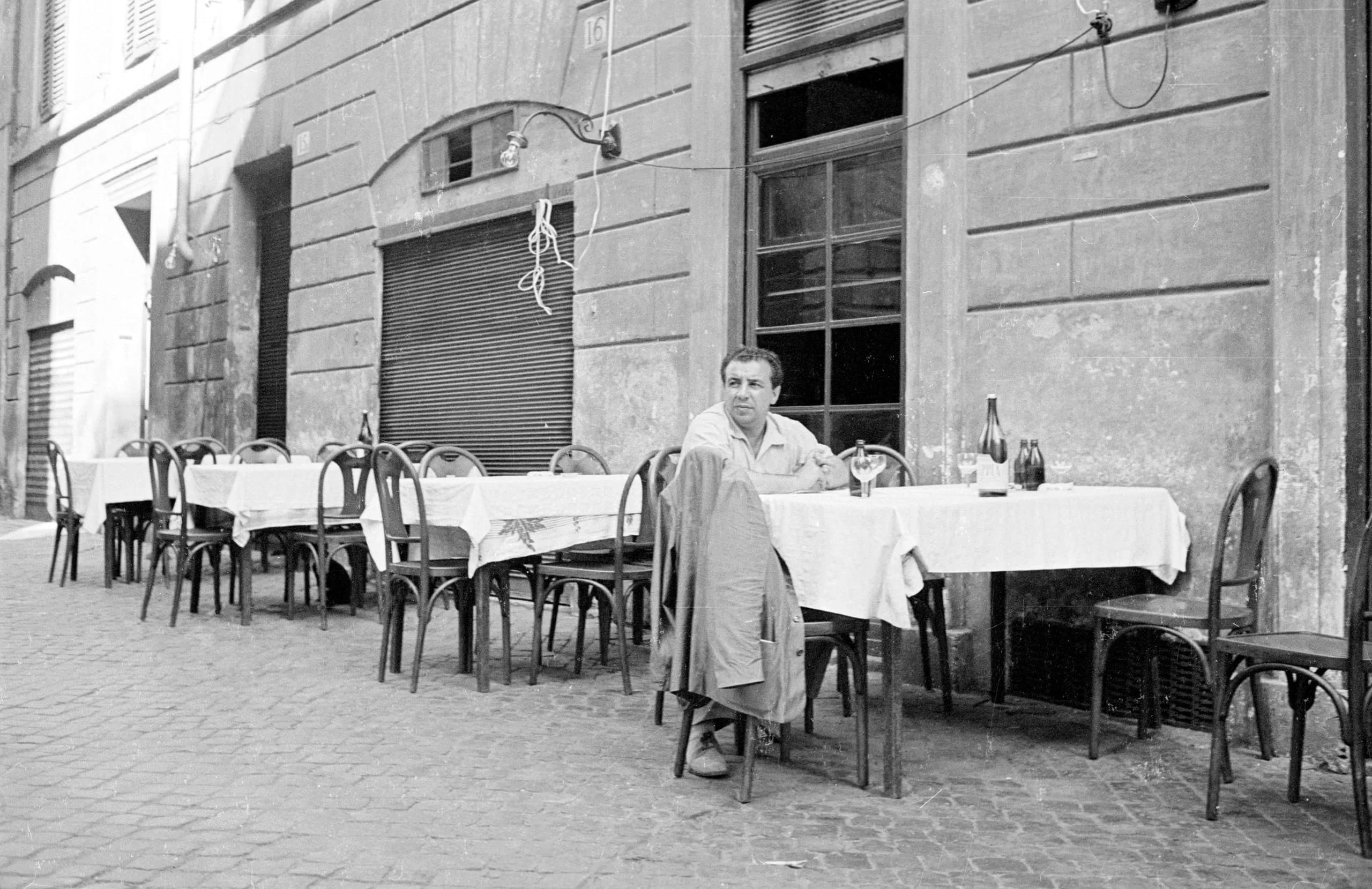 Black and white photograph of a man in a work apron seated alone at a white-clothed outdoor cafe table on a cobblestone sidewalk, looking at the camera