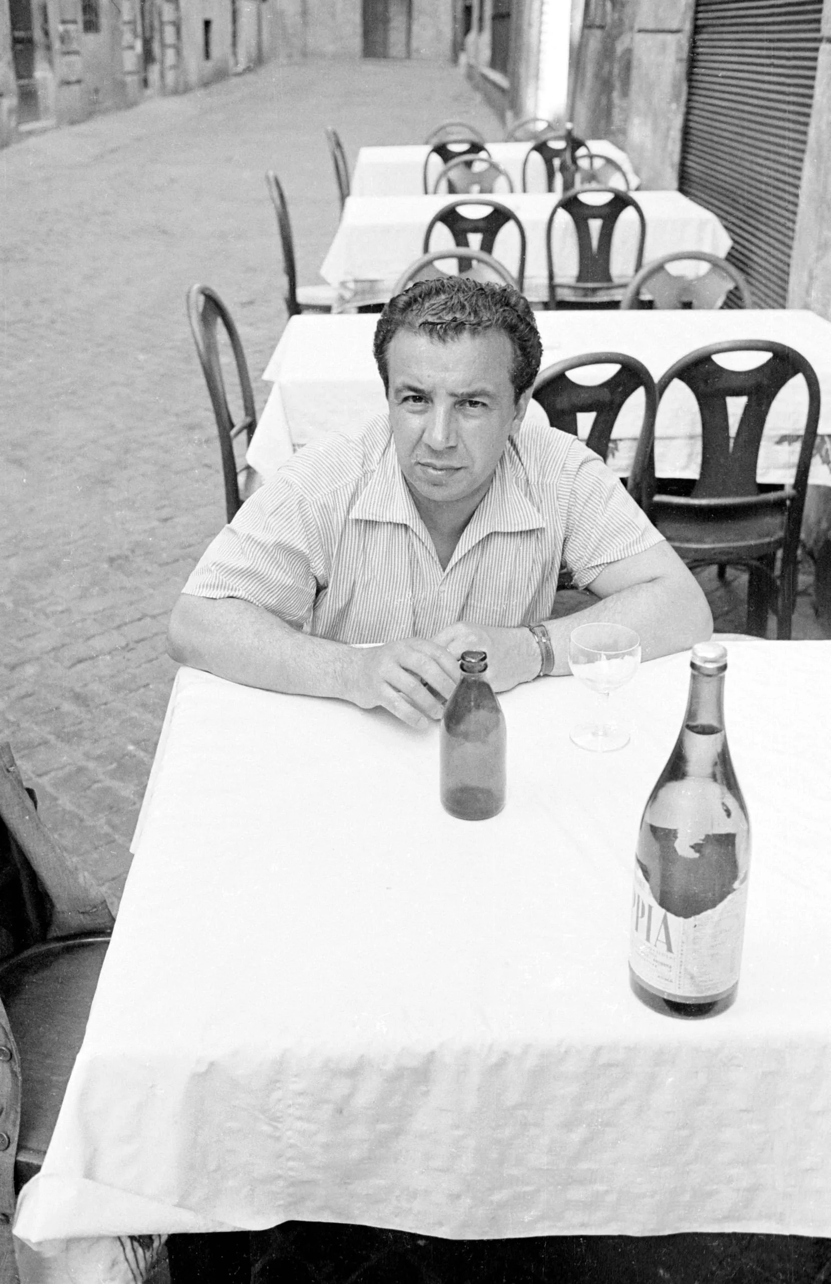 Black and white photograph of a man in a striped short-sleeve shirt seated at a white-clothed outdoor café table, two bottles in front of him, cobblestone street behind