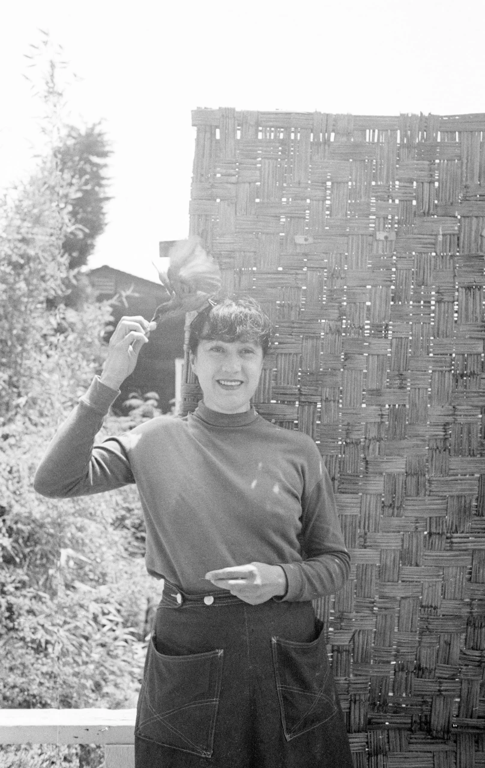 Black and white photograph of a smiling woman in a turtleneck and wide-legged trousers, holding a small dark object near her head, standing before a large woven bamboo panel