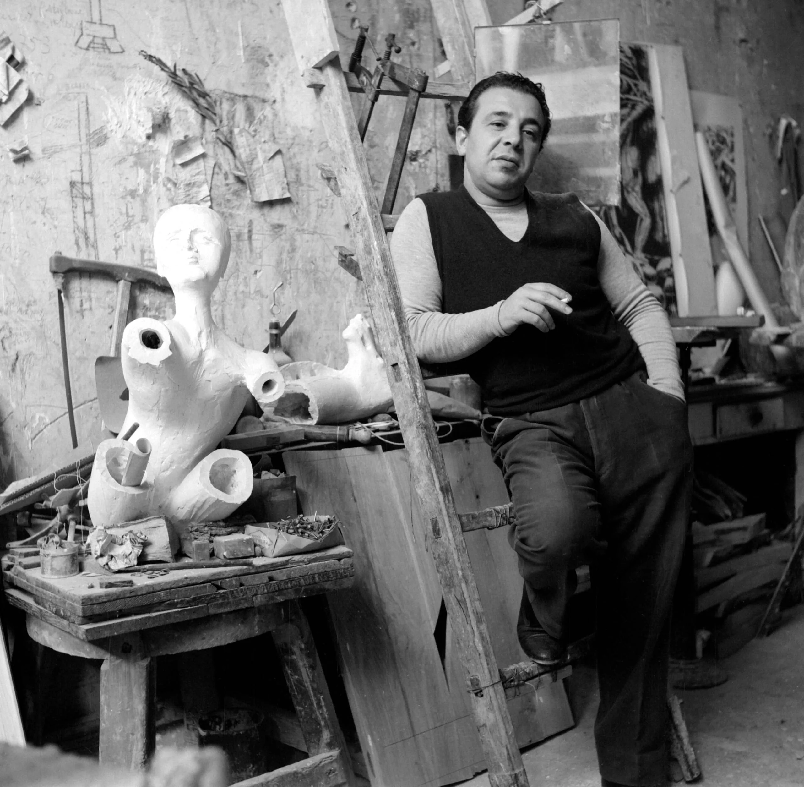 Black and white photograph of a man in a dark vest seated in an artist's studio beside an unfinished white plaster sculpture of a partial human figure