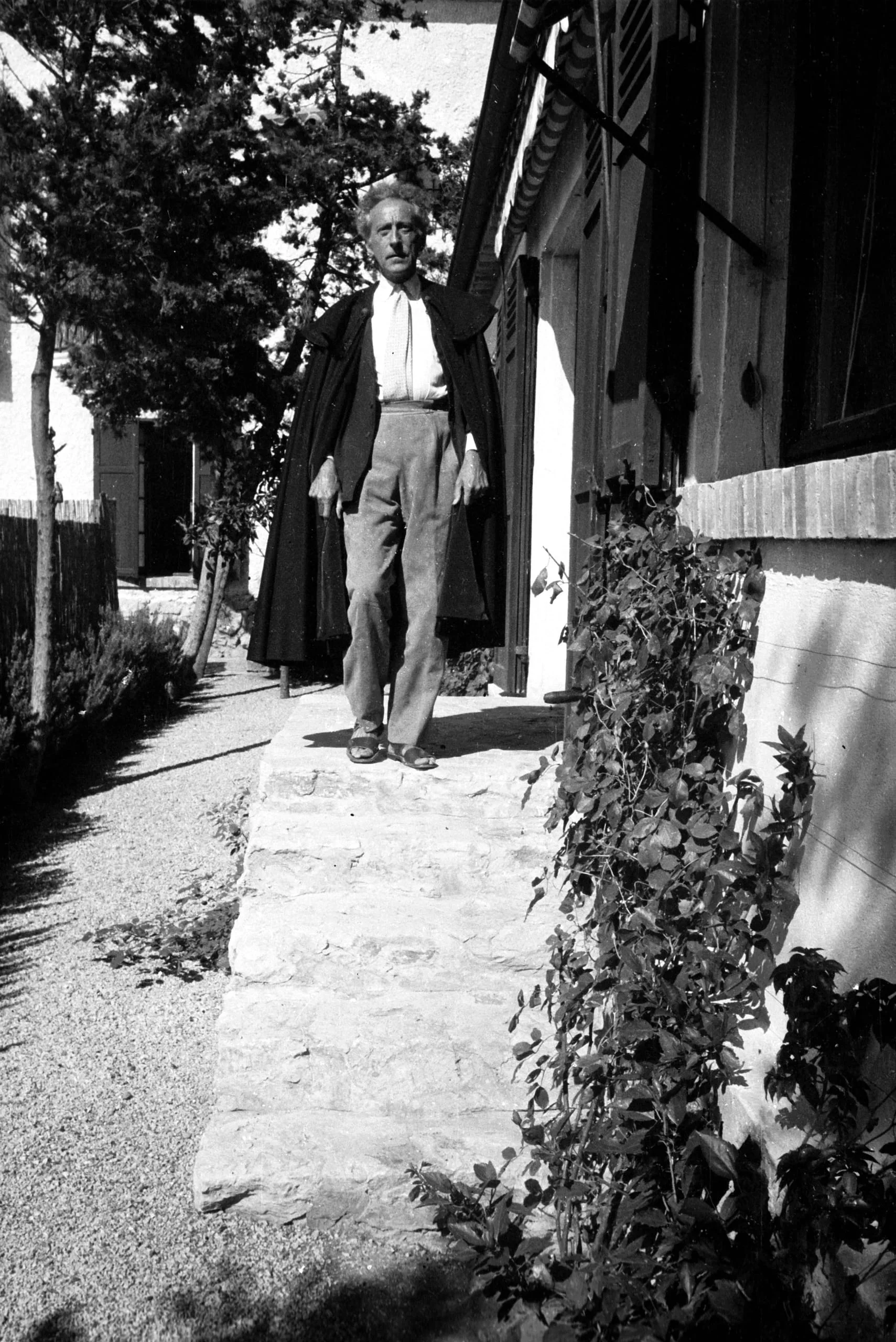 Black and white photograph of a man in a long dark cape and pale trousers walking toward the camera along a stone path beside a white building
