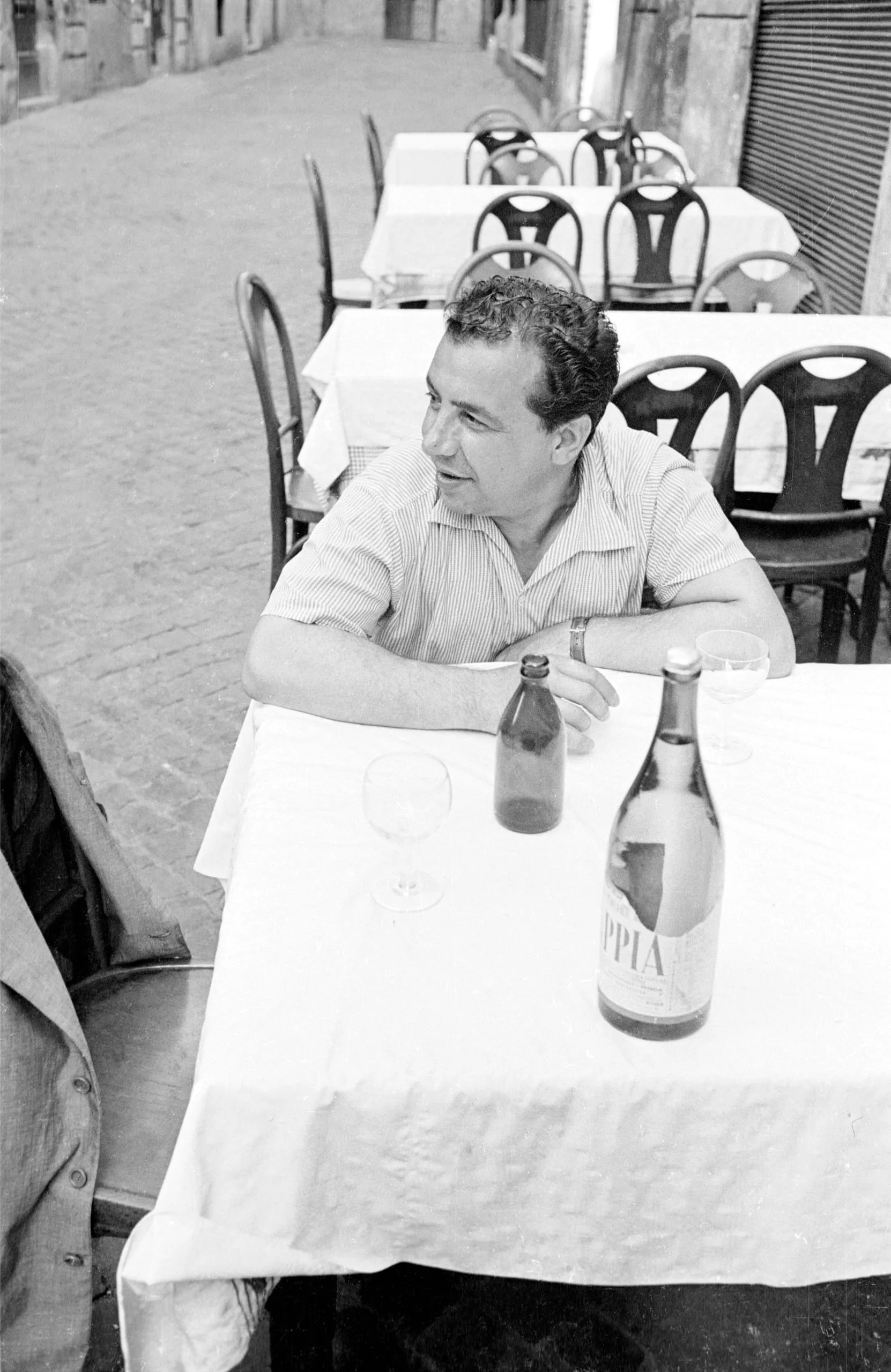 Black and white photograph of a man with dark curly hair sitting at an outdoor café table with wine glasses and bottles, looking to his right, cobblestone street behind him