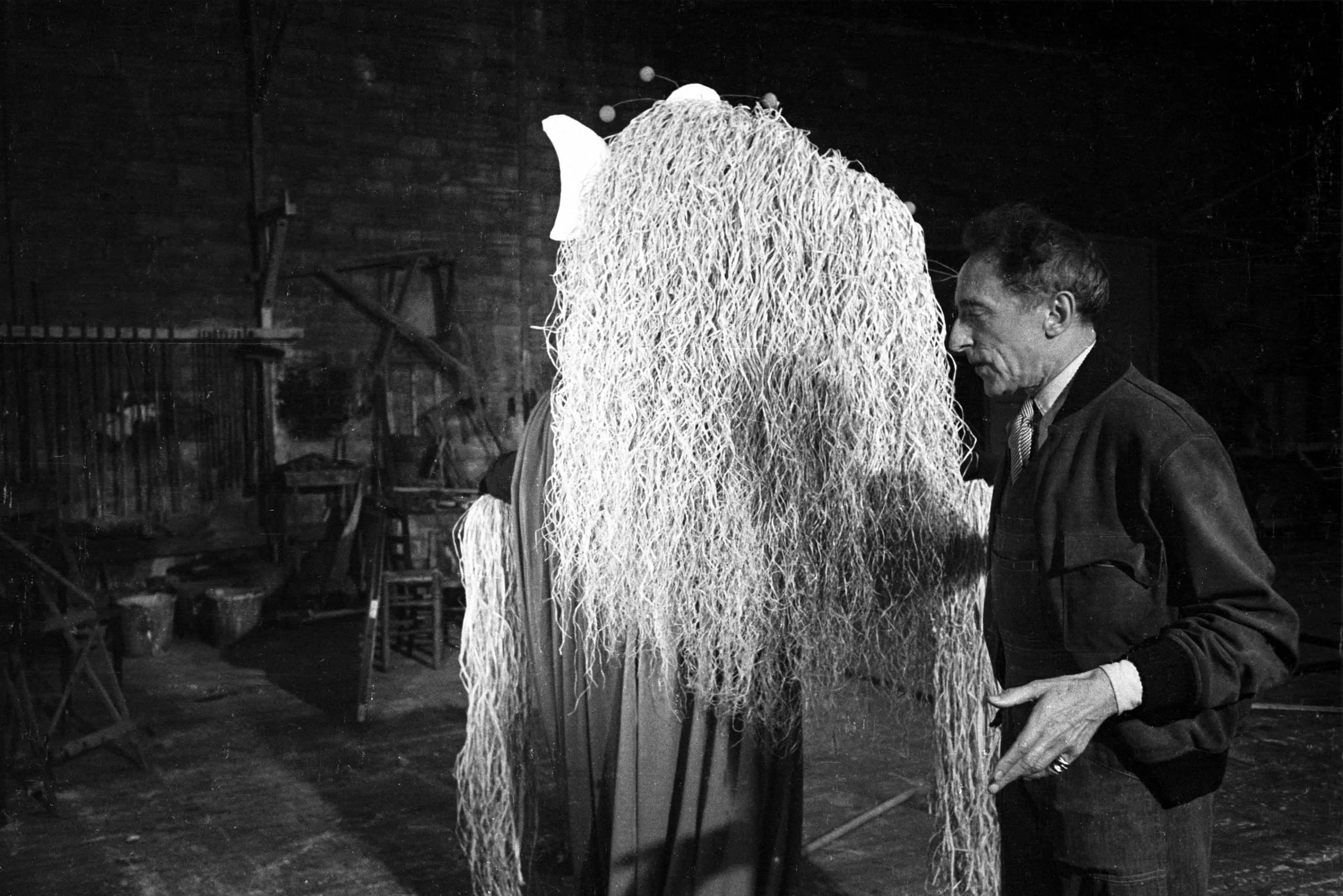 Black and white photograph of a man in a dark jacket examining a large wire or rope sculpture resembling a shaggy four-legged animal in a workshop