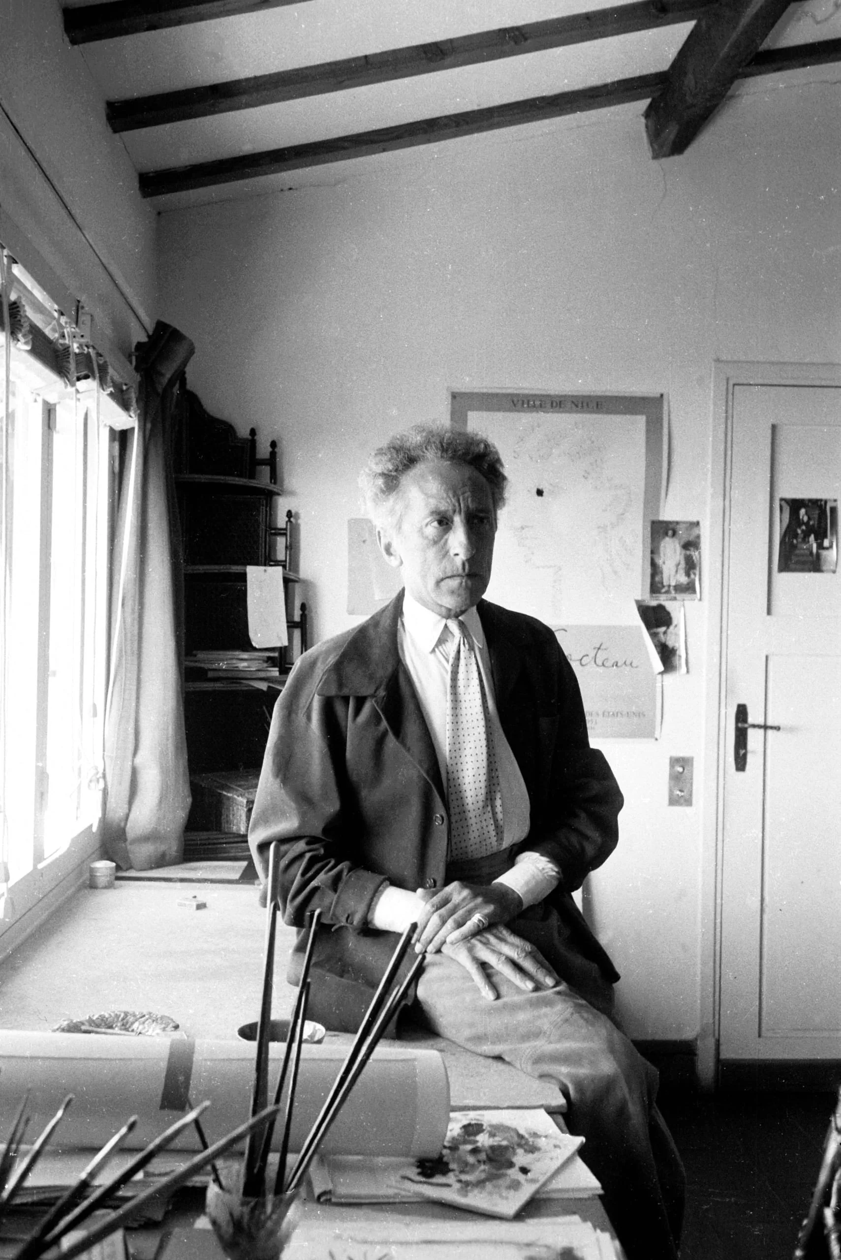 Black and white photograph of an elderly man seated in an interior workspace, hands folded in his lap, with paintbrushes and a stained palette in the foreground and a map of Nice pinned to the wall behind him