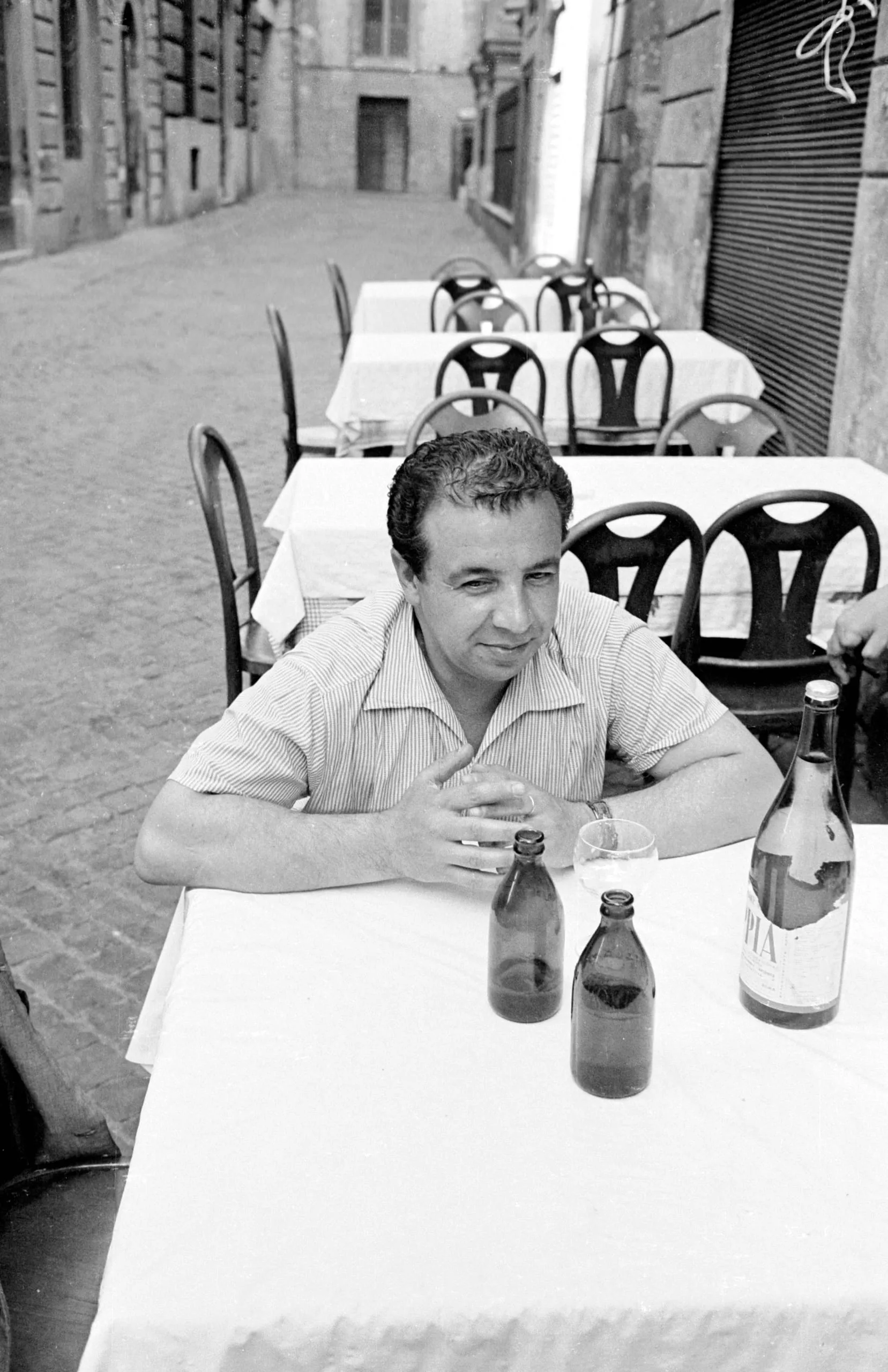 Black and white photograph of a man seated alone at a white-clothed outdoor café table on a narrow cobblestone street, leaning forward with a glass and bottles in front of him