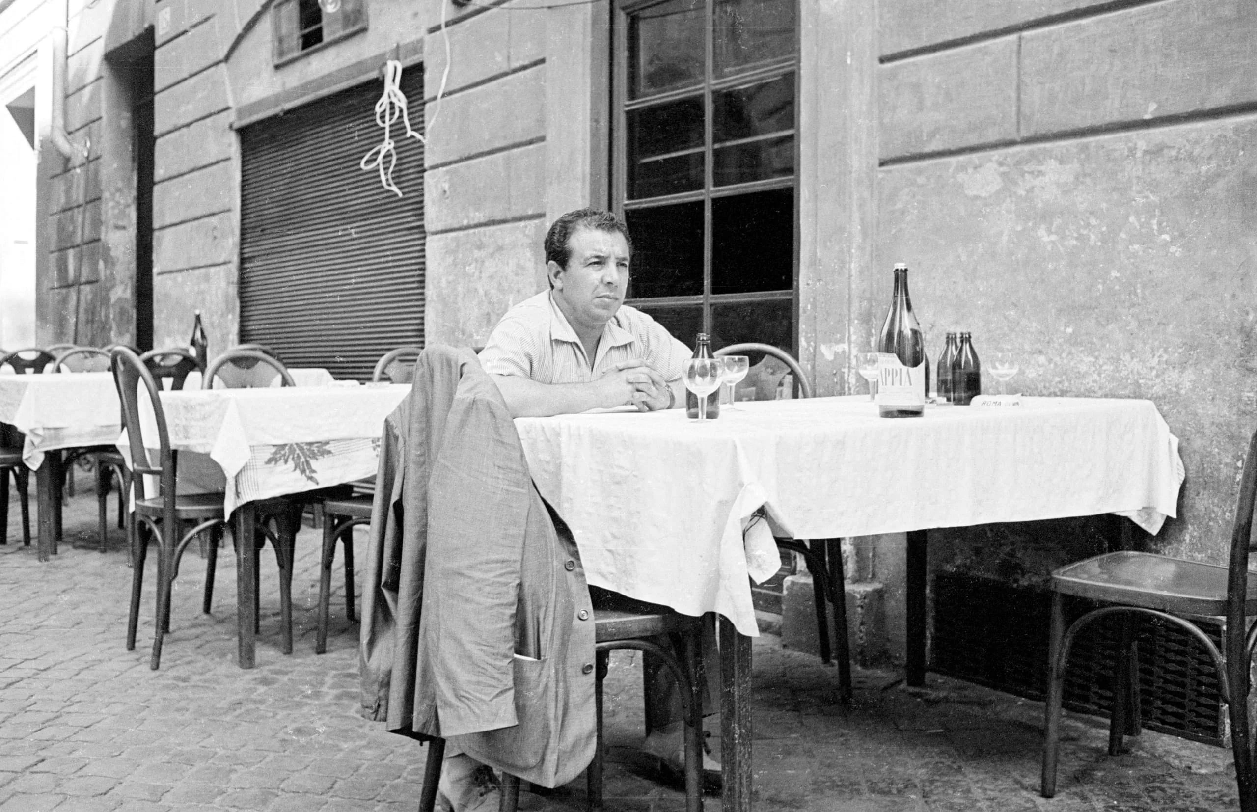 Black and white photograph of a man sitting alone at a white-clothed outdoor café table, with empty chairs and tables around him and a stone building facade behind
