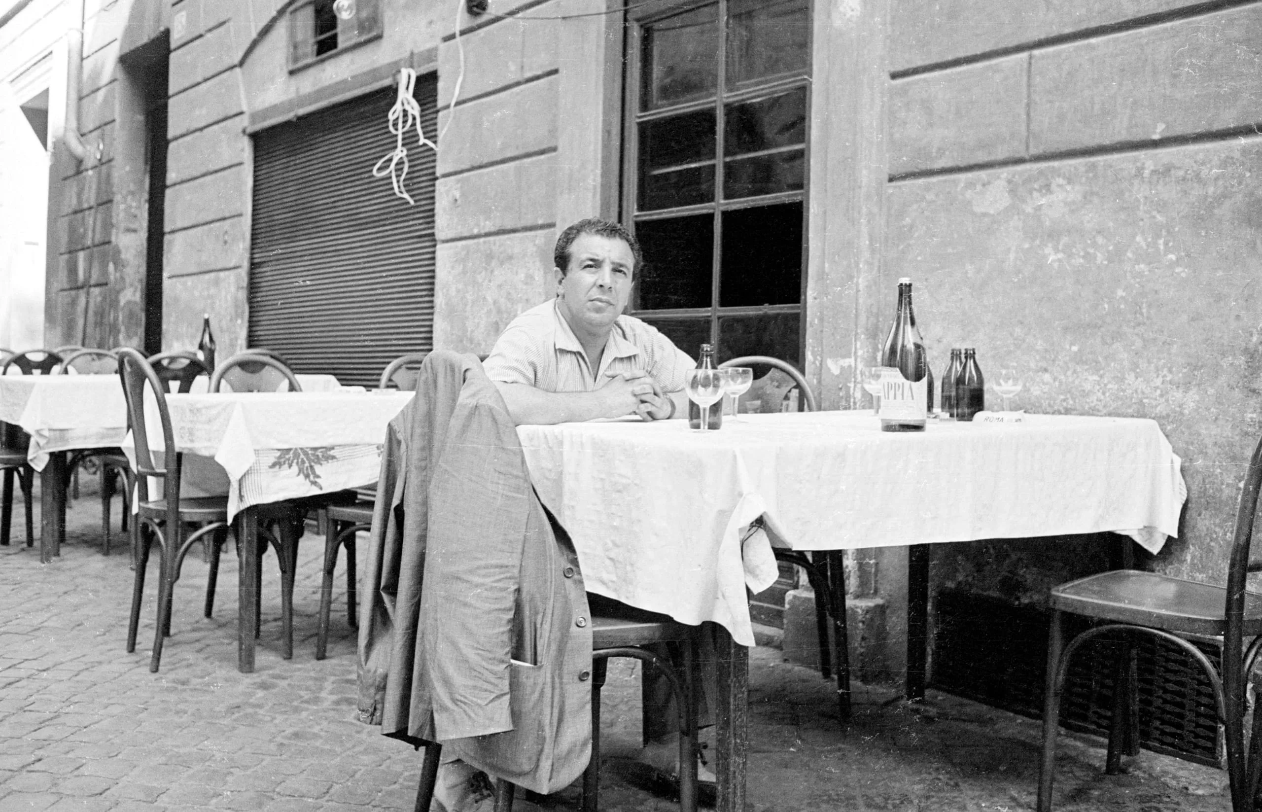 Black and white photograph of a man seated alone at a white-clothed outdoor restaurant table, arms resting on the table, looking directly at the camera, stone building wall behind him