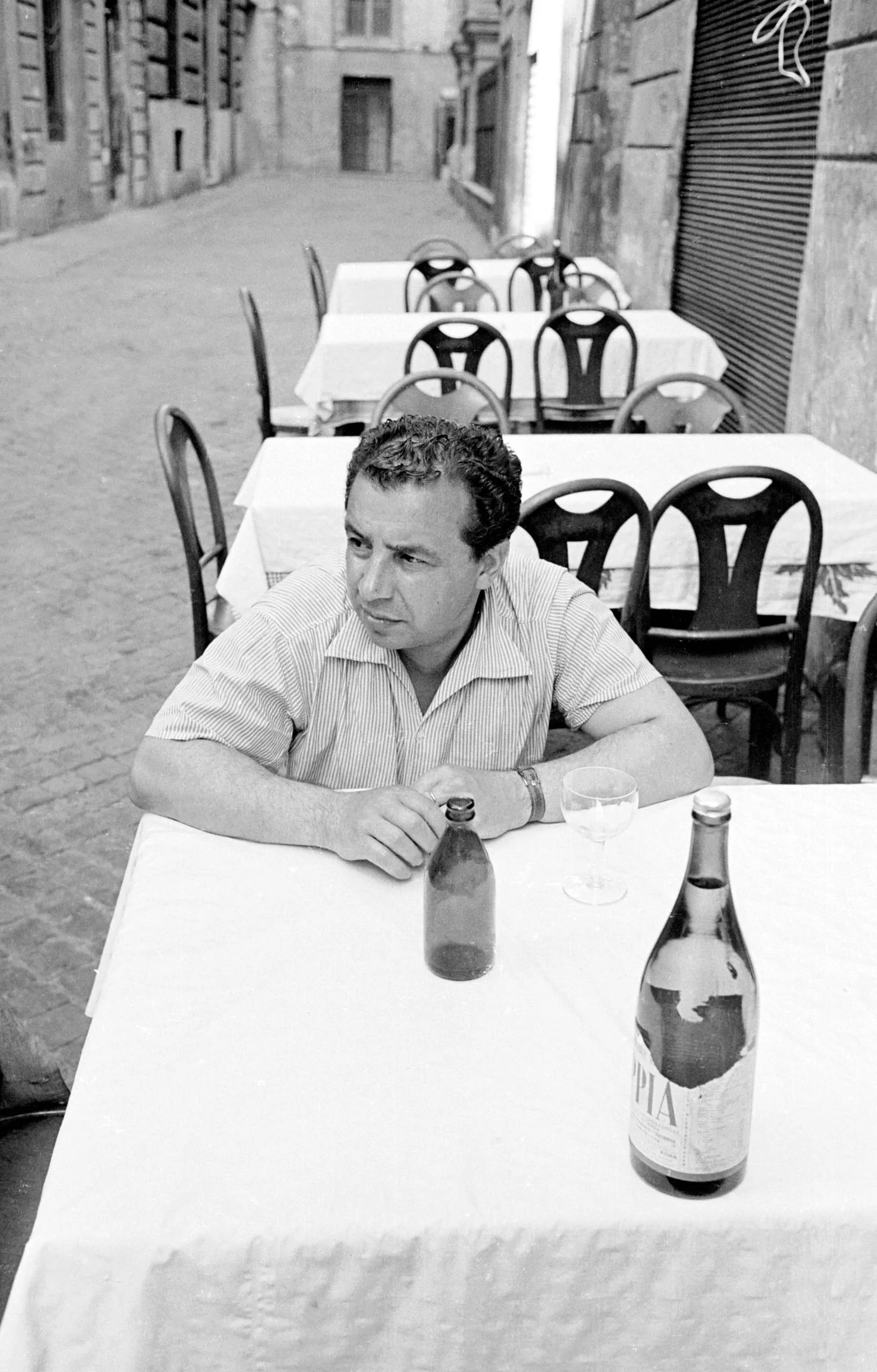 Black and white photograph of a man in a striped short-sleeved shirt seated alone at an outdoor café table with wine bottles, cobblestone alley behind him