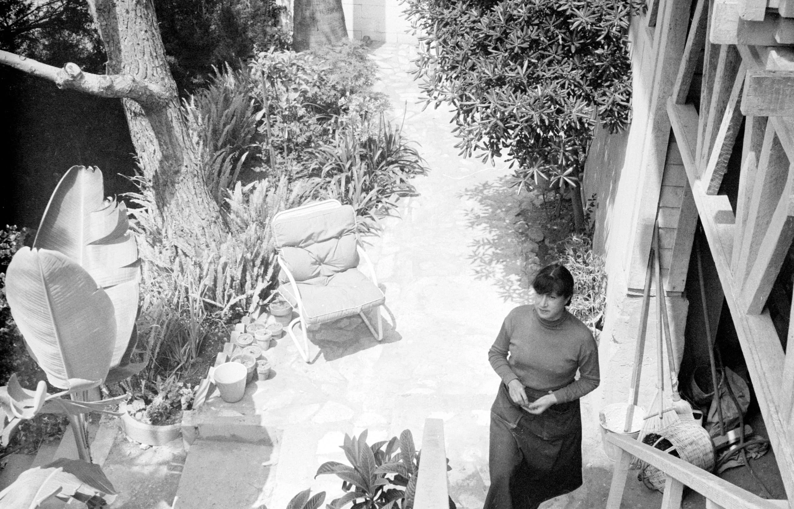 Black and white photograph taken from above, showing a woman in dark clothing standing on a garden patio surrounded by lush plantings and an empty cushioned chair