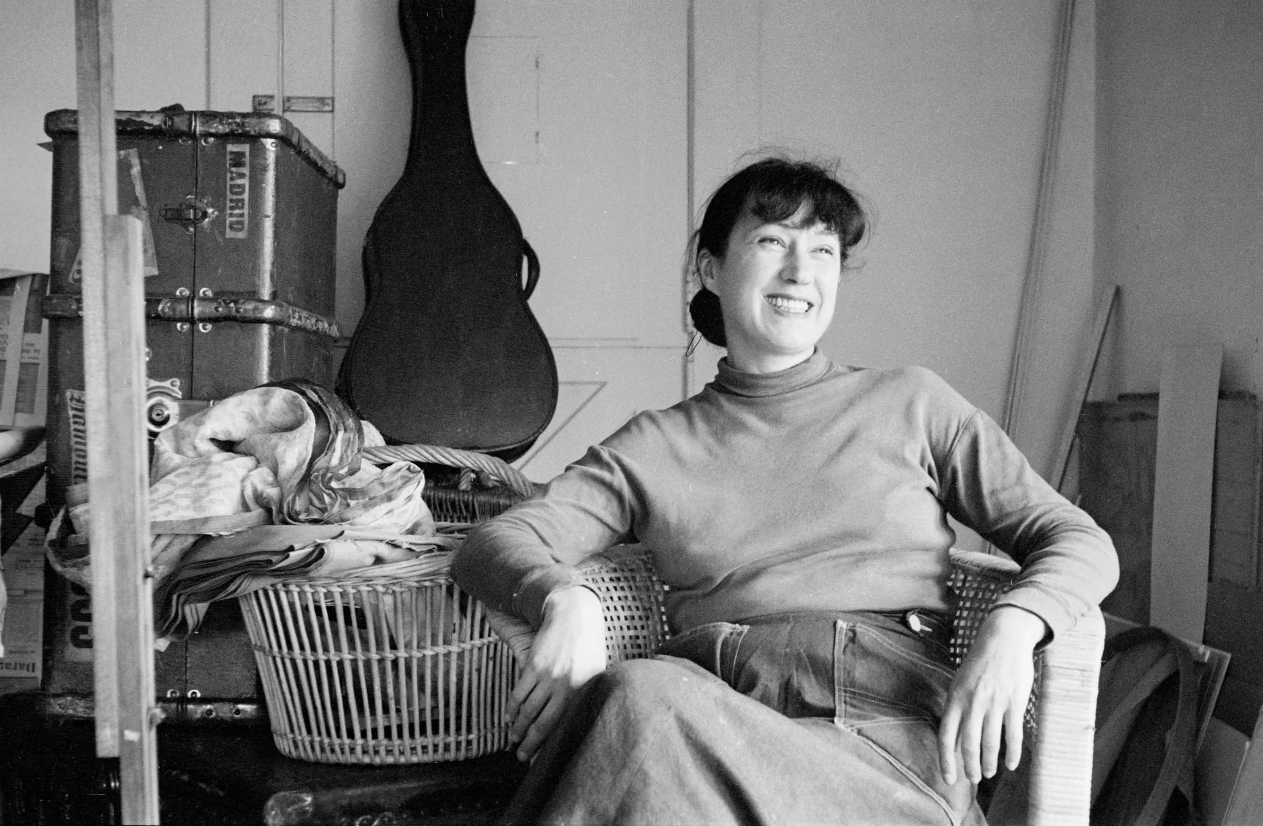 Black and white photograph of a woman seated in a wicker chair, smiling, wearing a turtleneck sweater, with a travel trunk labeled "MADRID" and a guitar case visible behind her