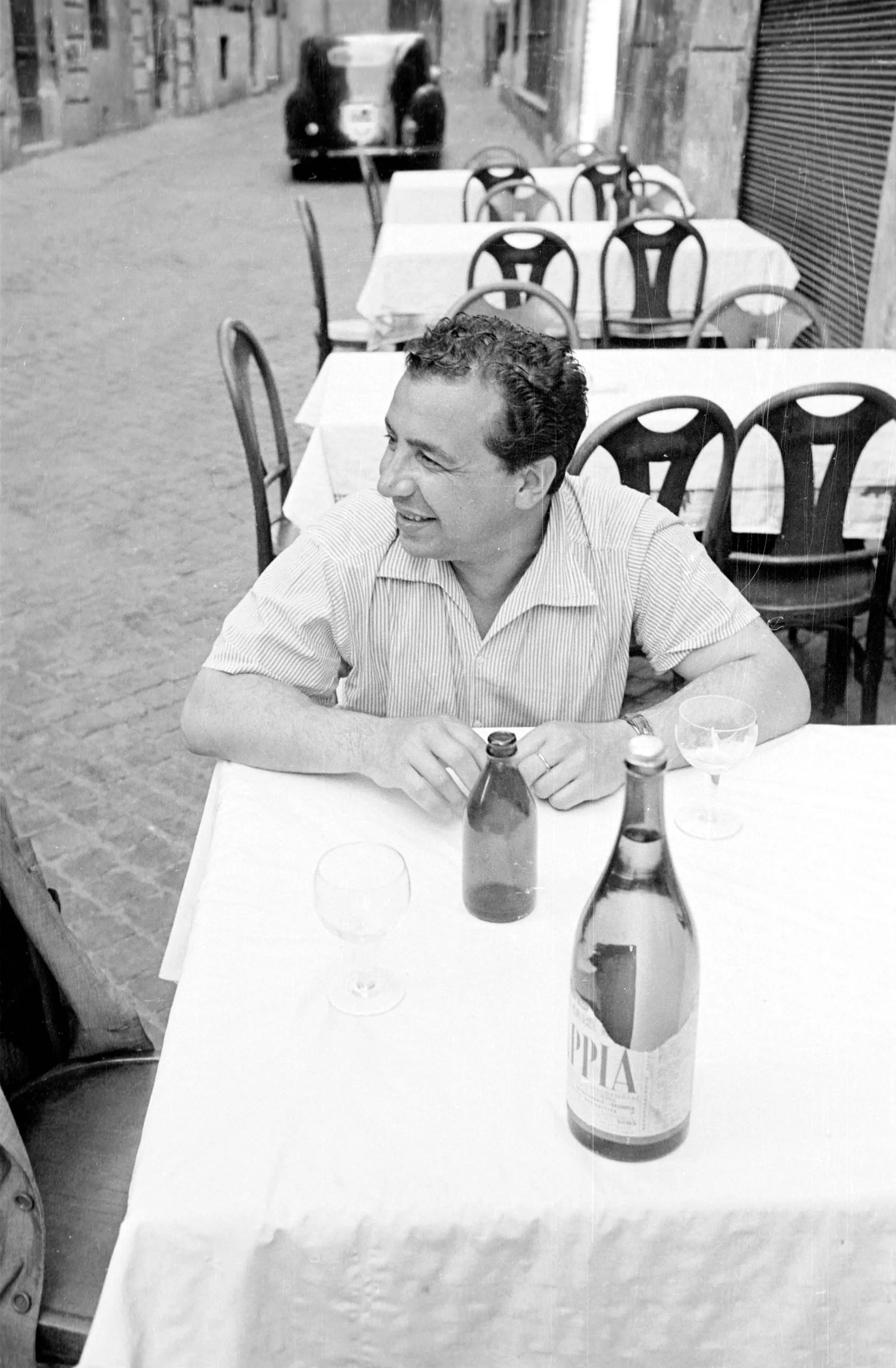 Black and white photograph, man with curly dark hair seated at an outdoor café table, smiling to his right, with bottles and wine glasses on a white tablecloth, cobblestone street behind him