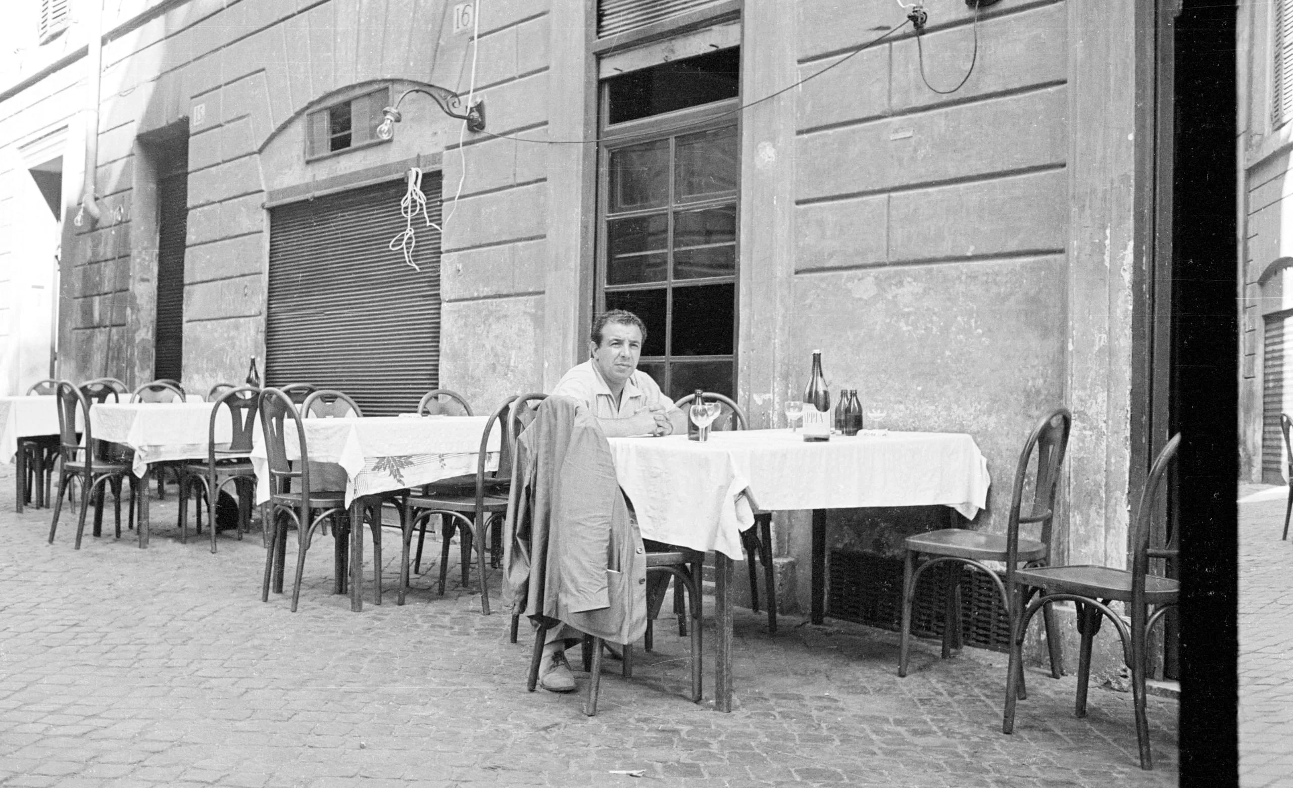 Black and white photograph of a man in a work coat seated alone at a white-clothed outdoor café table on a cobblestone street, two wine bottles before him, empty tables and chairs stretching to the left