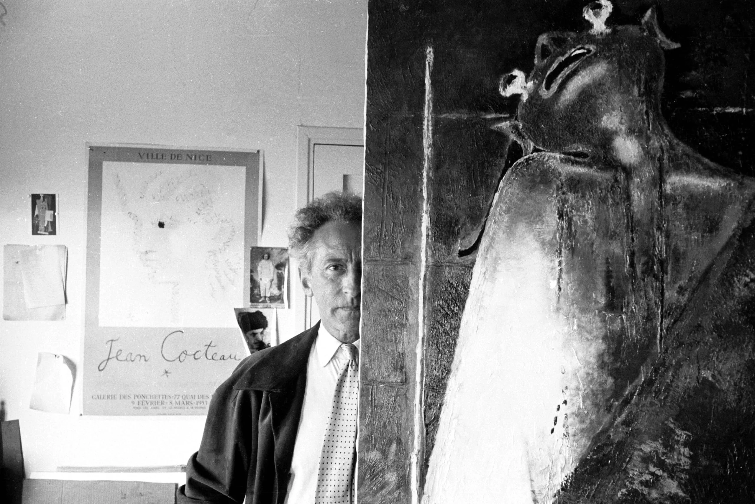 Black and white photograph of a man in a dark blazer standing beside a large, dark expressionist painting, with a Jean Cocteau exhibition poster visible on the wall behind him