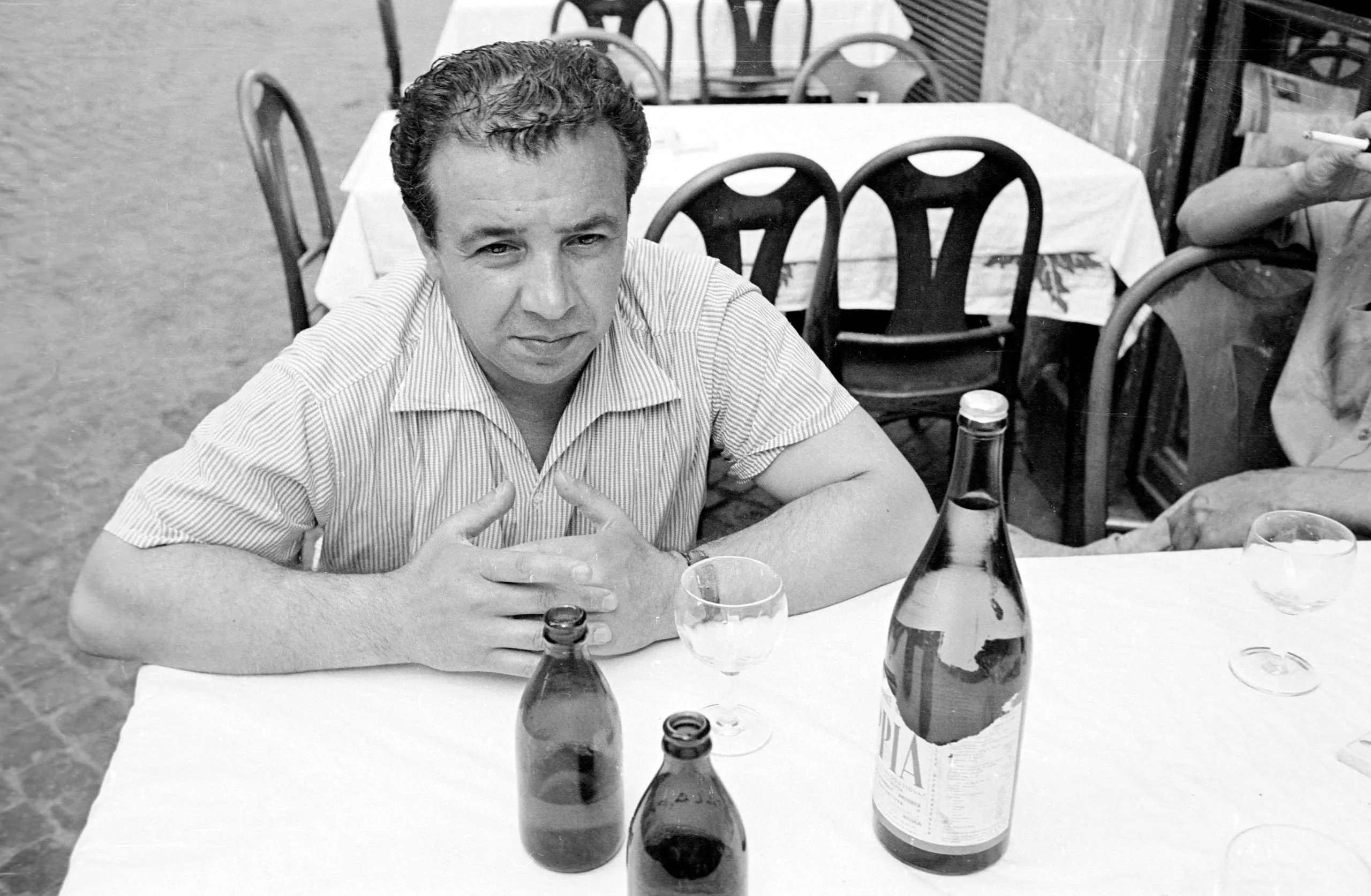 Black and white photograph of a curly-haired man in a striped shirt leaning over a café table with wine bottles and empty glasses