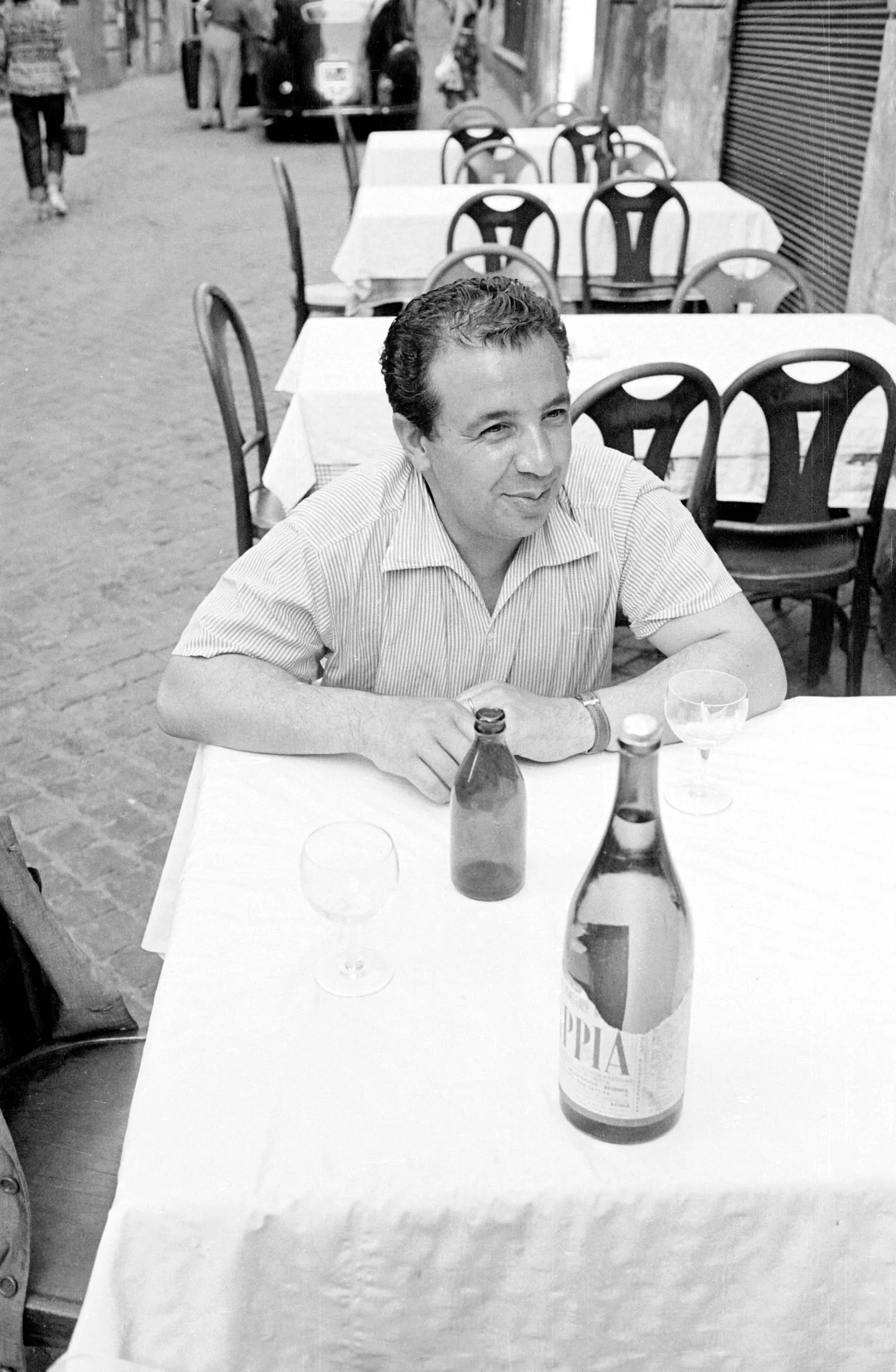 Black and white photograph of a man with dark hair sitting at a white-clothed outdoor café table with two bottles and wine glasses, cobblestone street behind him