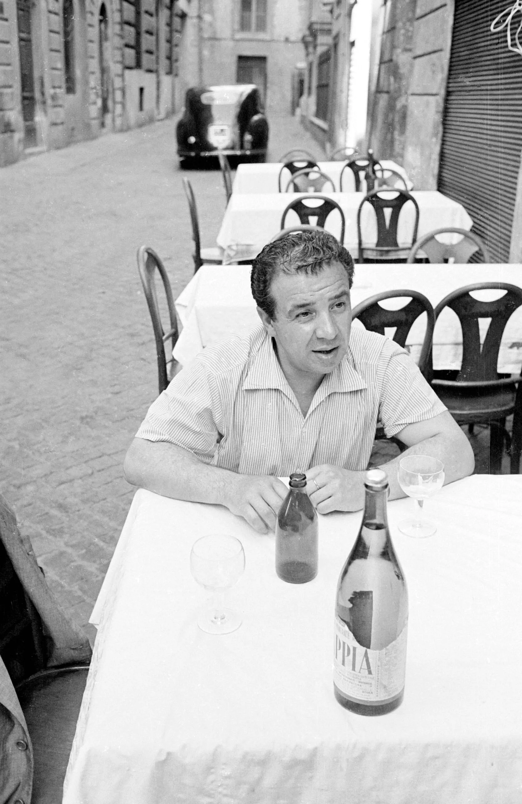 Black and white photograph of a man at an outdoor café table on a cobblestone street, two bottles and empty wine glasses in front of him