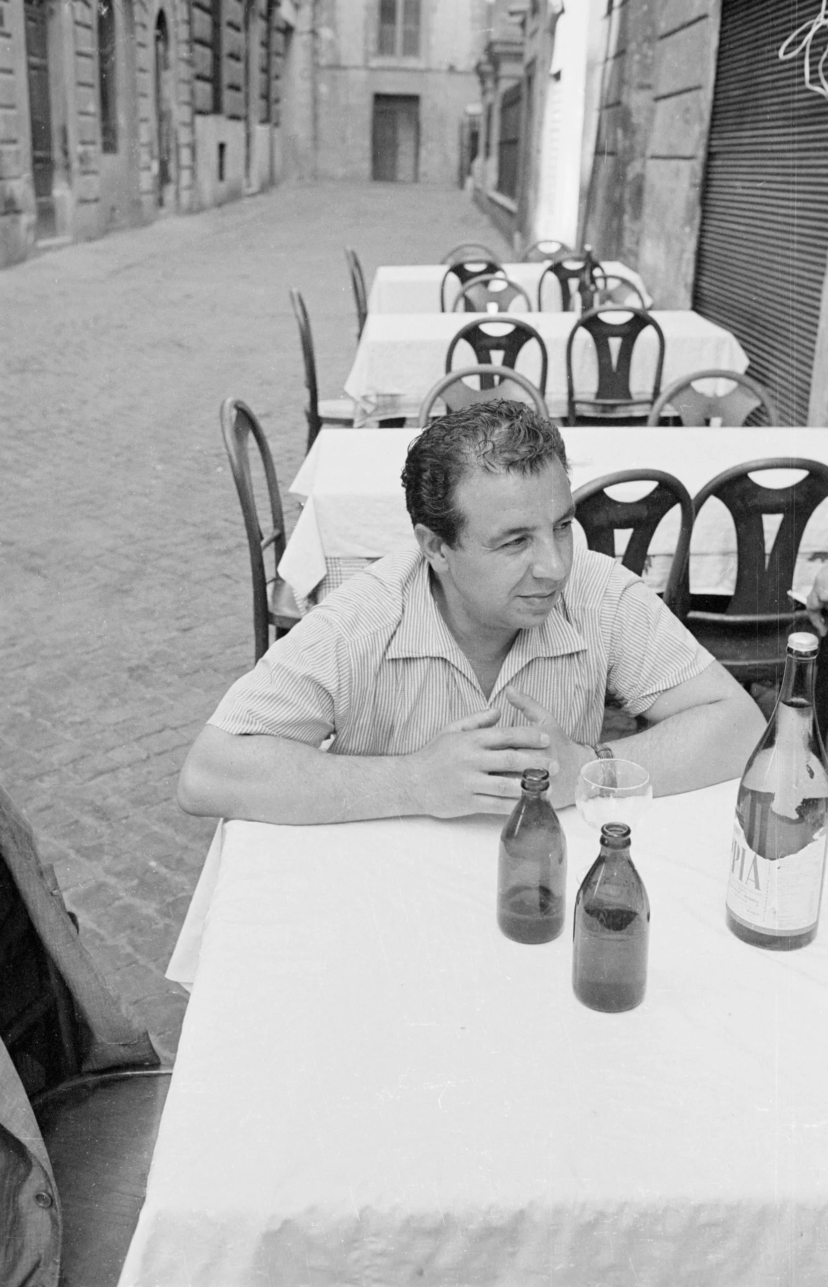 Black and white photograph of a man seated alone at an outdoor café table with bottles in front, cobblestone street and empty tables behind him