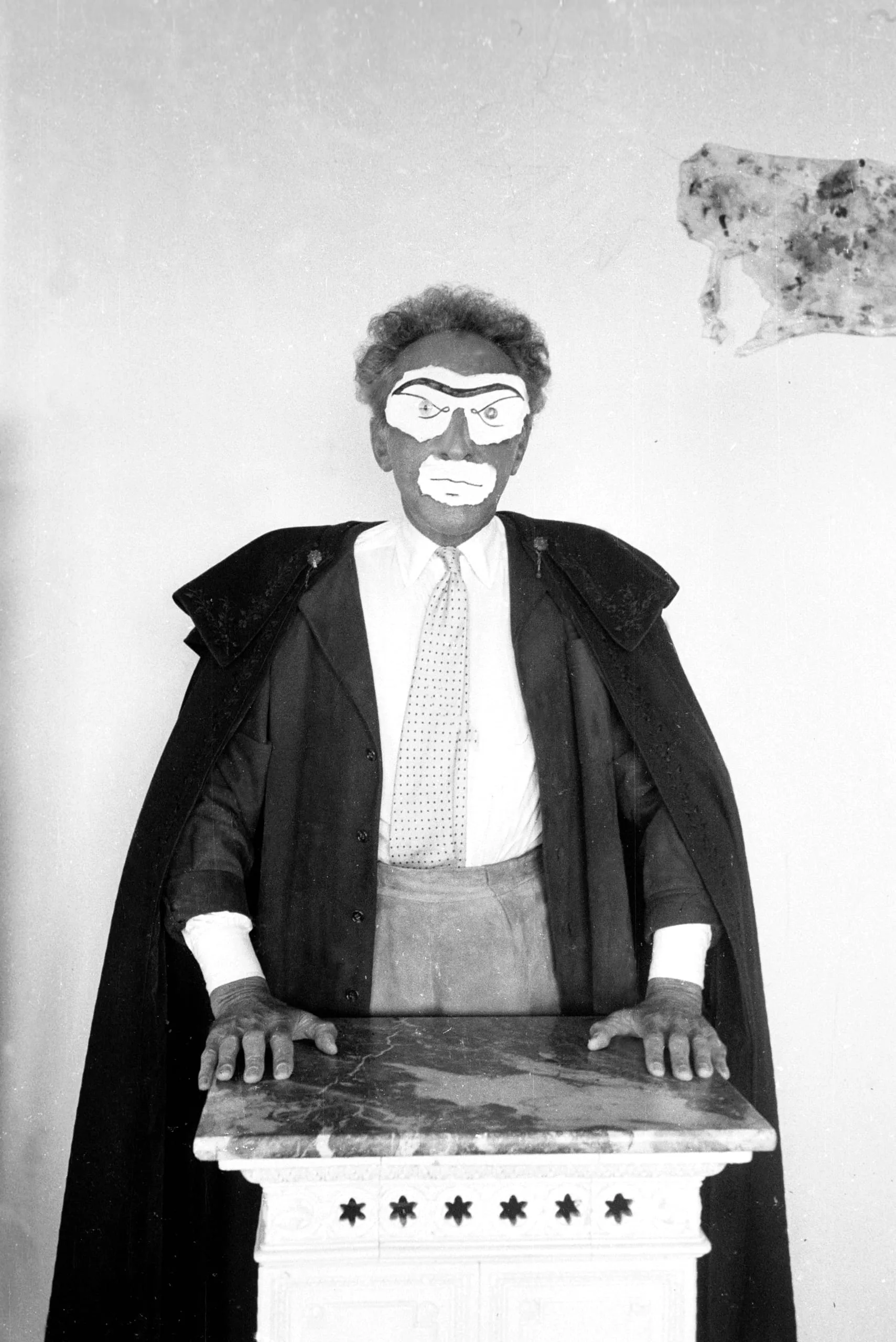 Black and white photograph of a person in a dark cape and suit standing behind a white pedestal, wearing a flat painted mask with exaggerated facial features