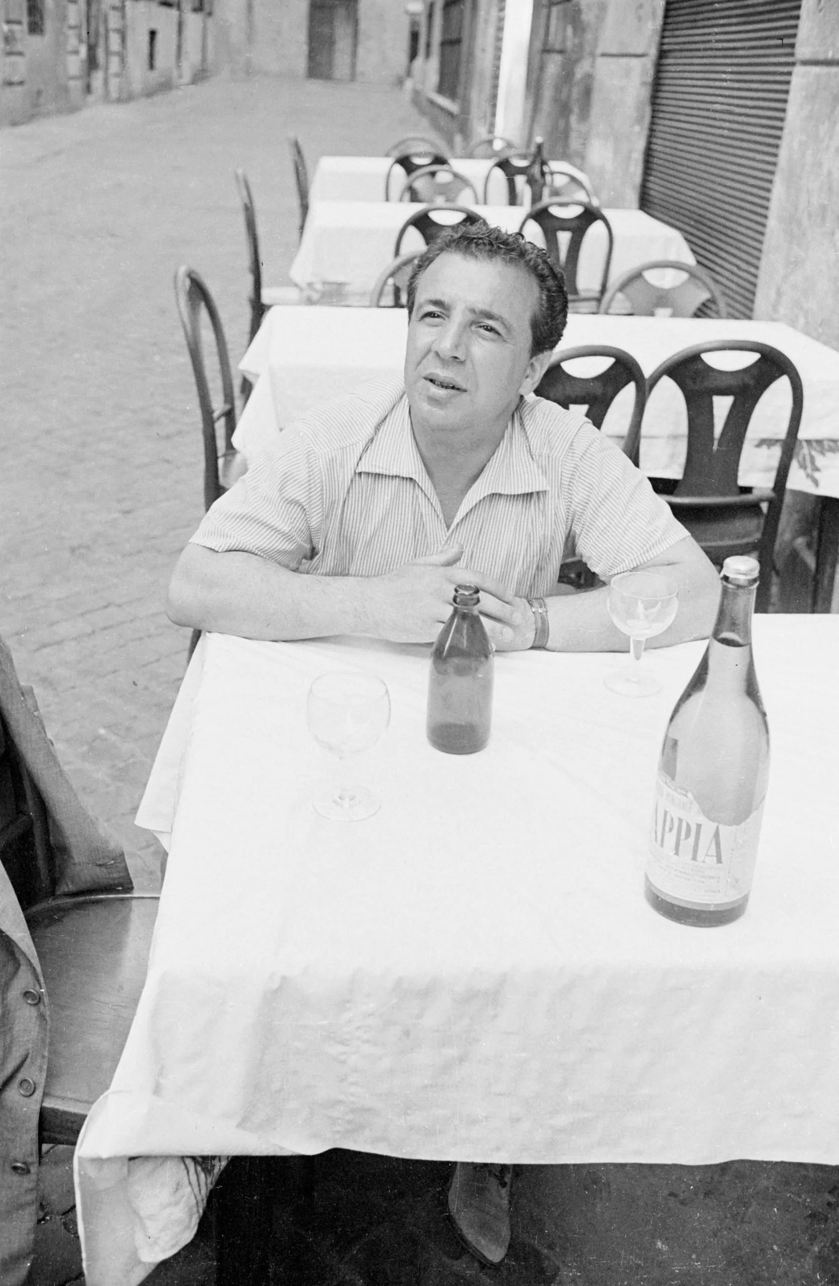 Black and white photograph of a man seated at an outdoor café table with white tablecloth, two wine glasses, and bottles, cobblestone alley behind him
