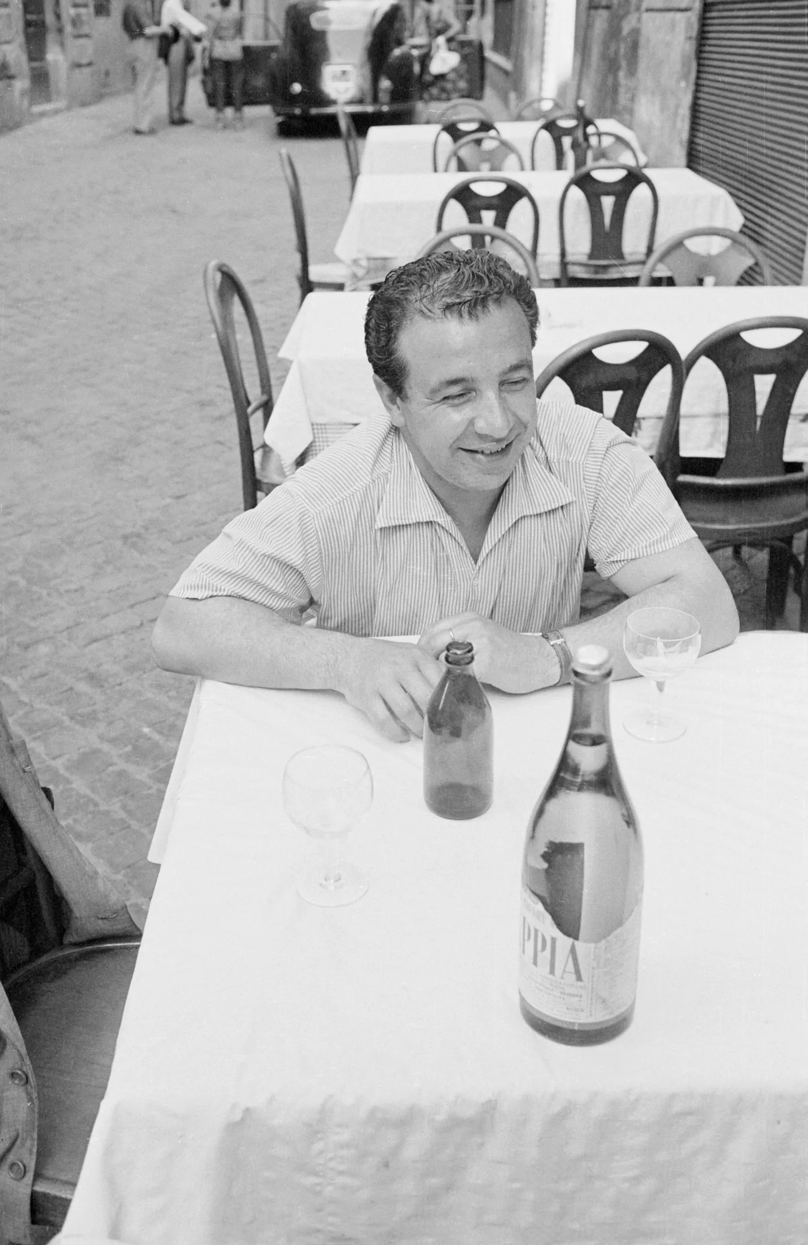 Black and white photograph of a smiling man seated at a white-clothed outdoor café table, leaning forward with bottles and wine glasses in front of him, cobblestone street in the distance