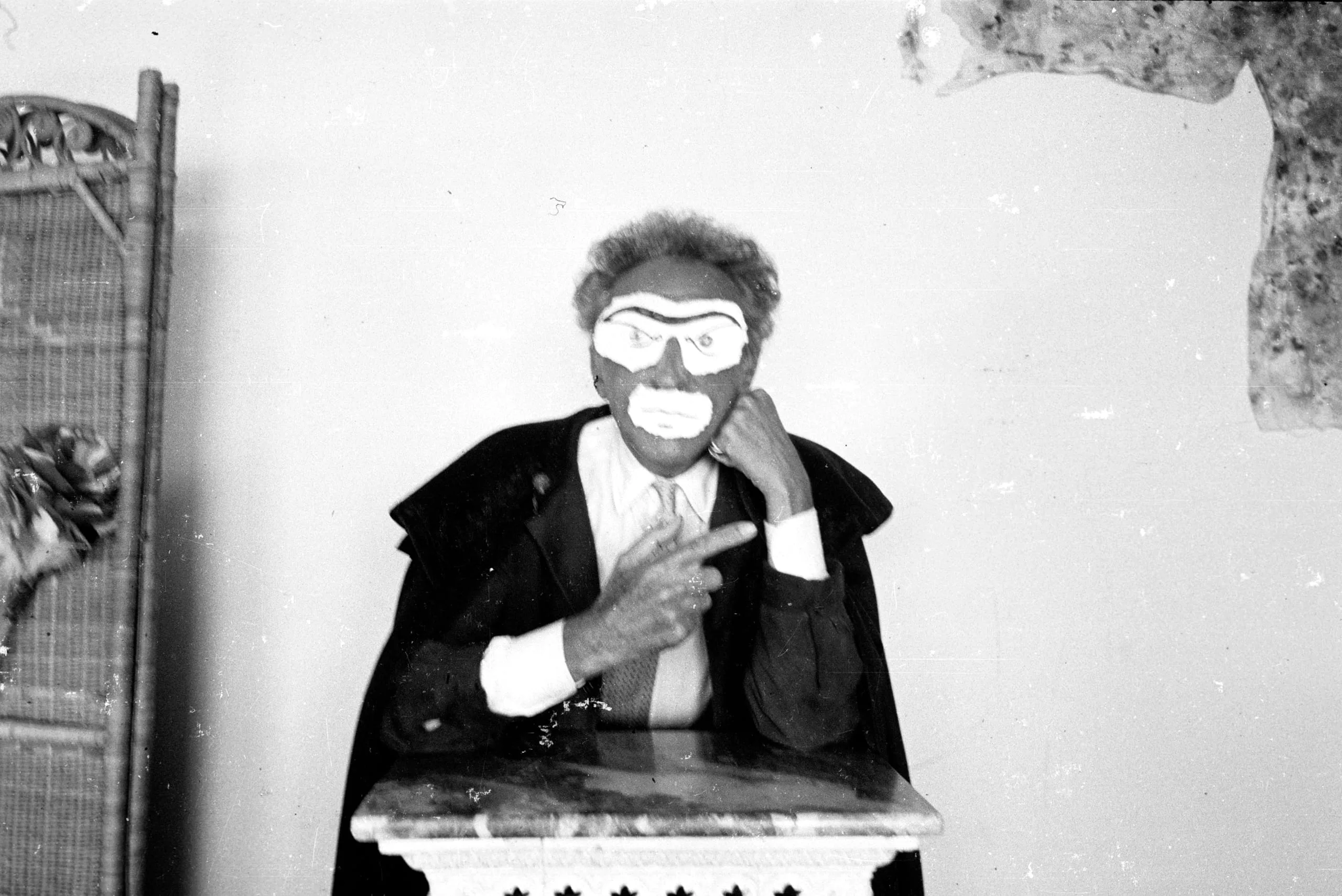 Black and white photograph of a man in a dark cape and painted face mask standing behind a star-decorated ledge, one finger pointed toward the camera