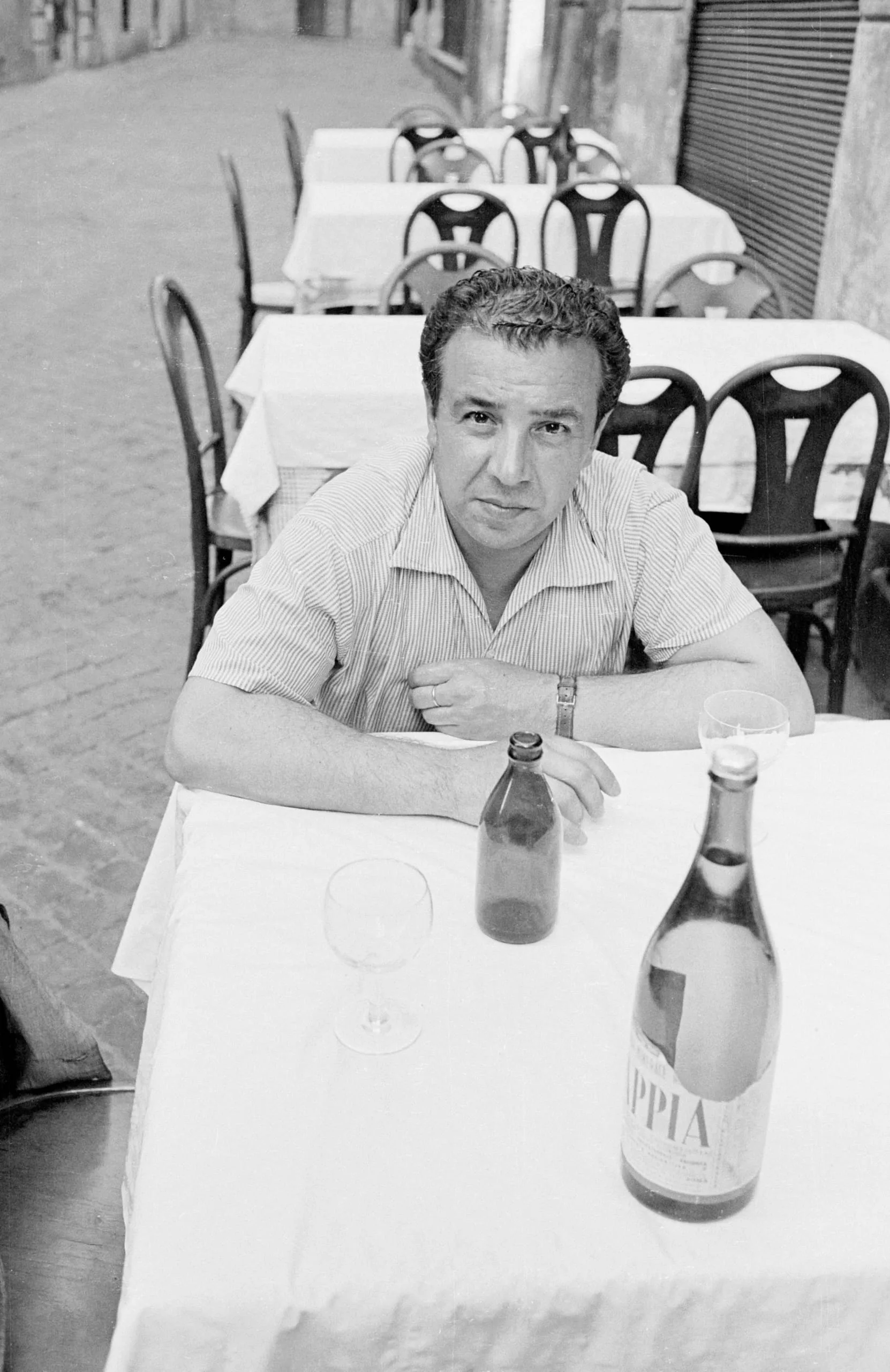 Black and white photograph of a man with dark curly hair seated at an outdoor café table, looking directly at the camera, with two bottles in front of him and empty tables behind